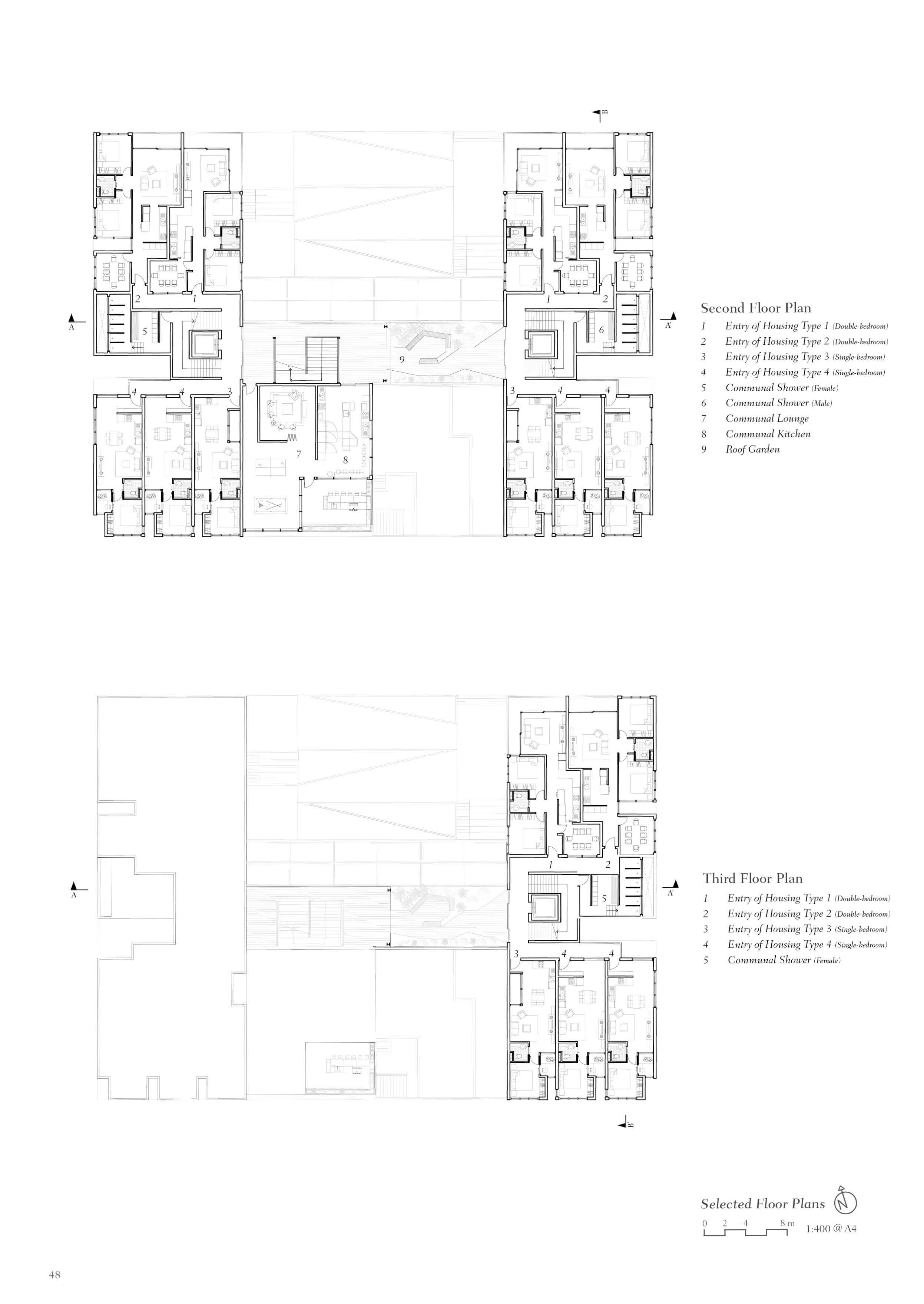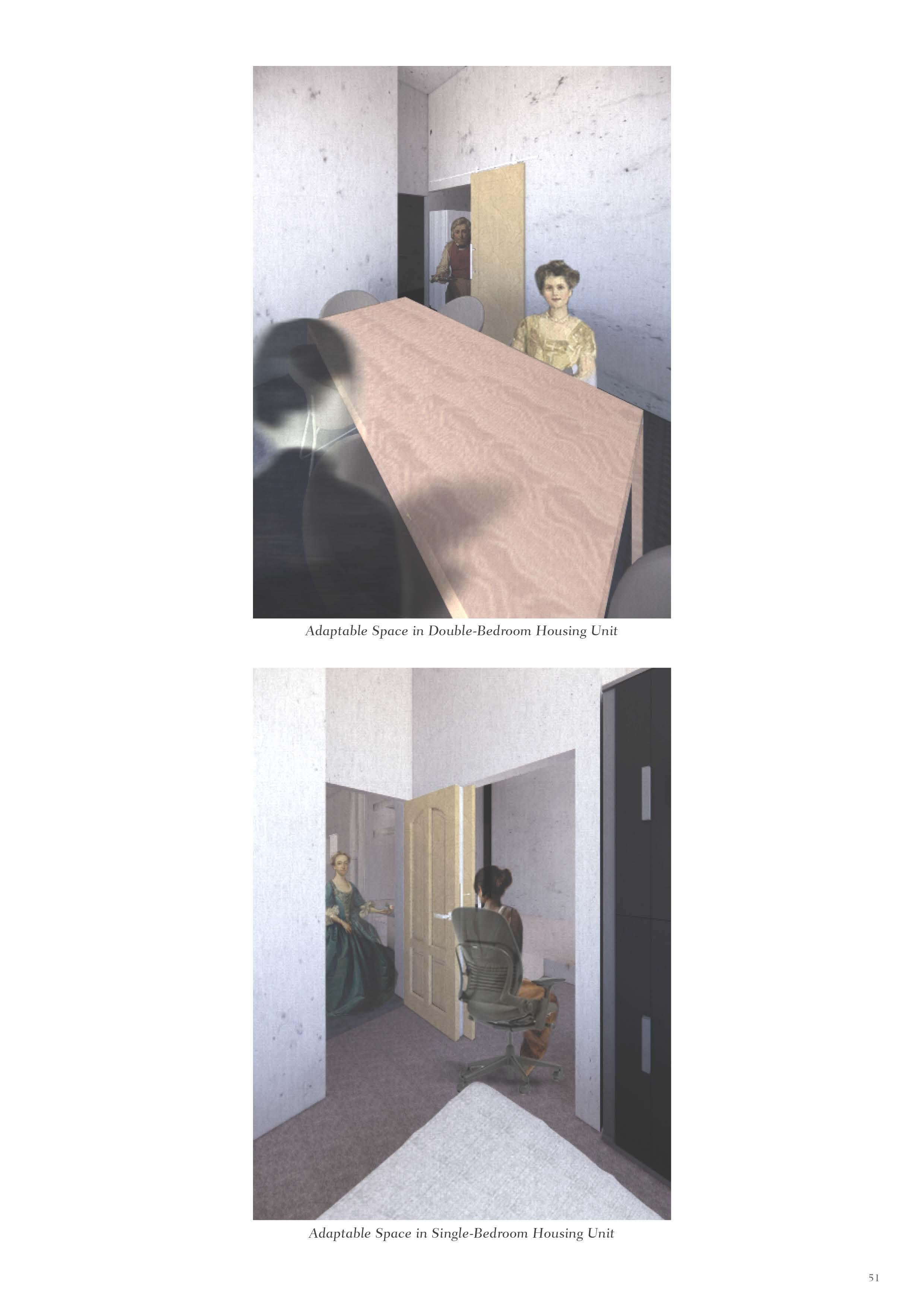 An ' adaptable space ' is designed for each type of housing unit. For double-bedroom units, the idea of creating an 'internal ring' is applied. Closing off either openings will result different programs in the adaptab le space. Whereas for the singlebedroom space, the 'adaptable space ' is located in the bedroom, and can be turned into a study room, or a temporaty bedroom with the help of the foldable desk and sliding door.