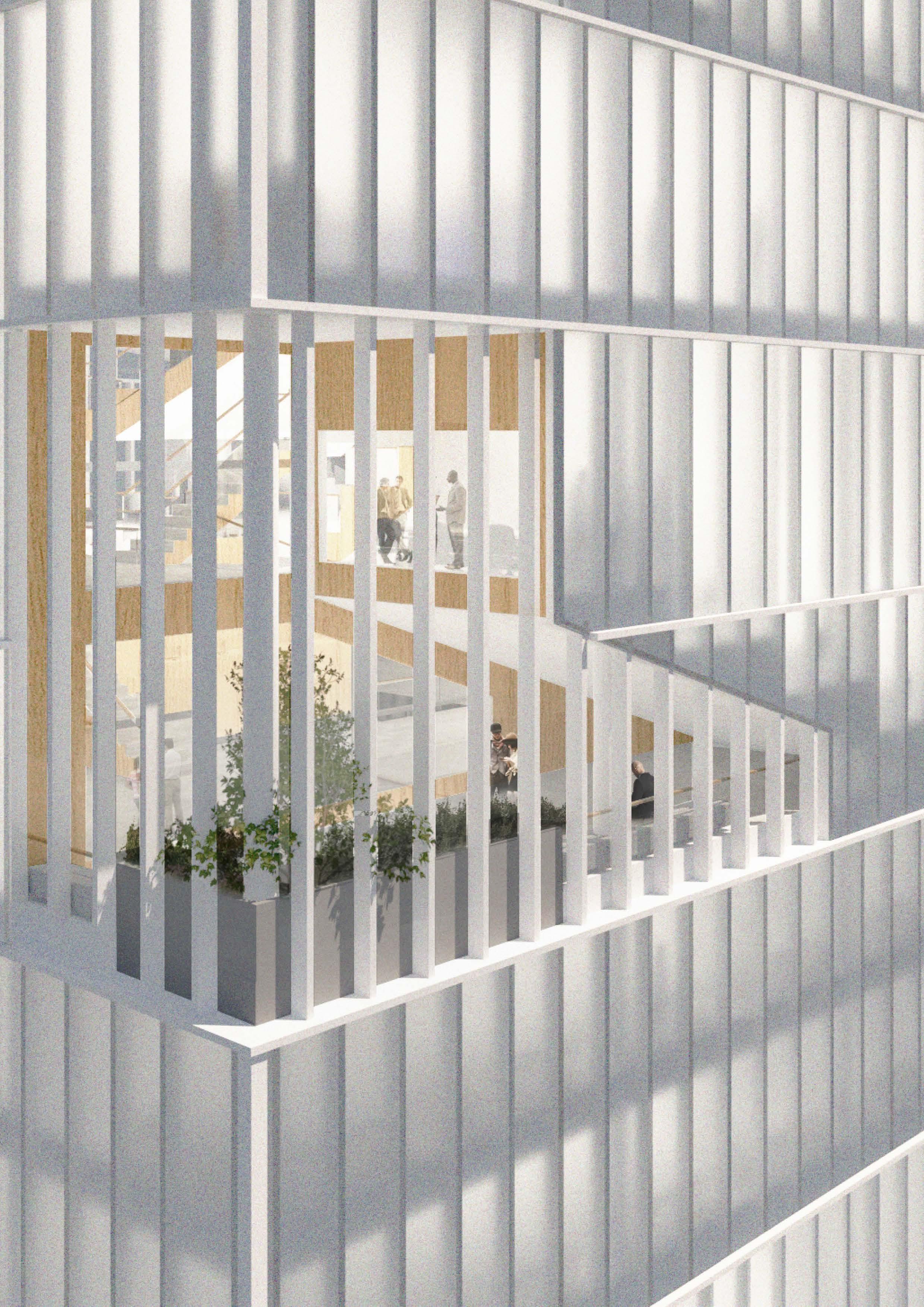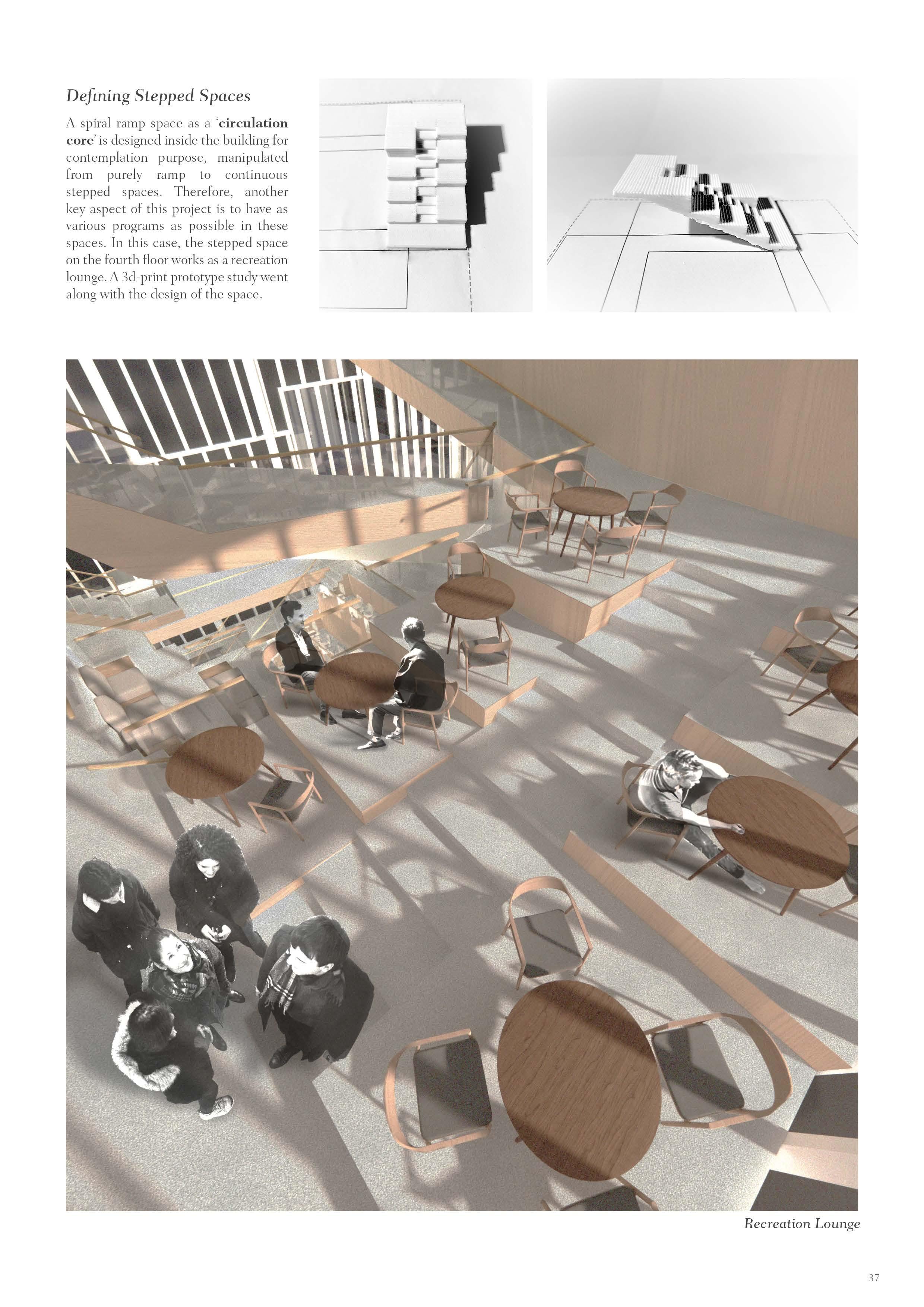 A spiral ramp space as a 'circulation core' is designed inside the building for contemplation purpose, manipulated from purely ramp to continuous stepped spaces. Therefore, another key aspect of this project is to have as various programs as possible in these spaces. In this case, the stepped space on the fourth floor works as a recreation lounge. A 3d-print prototype study went along with the design of the space.