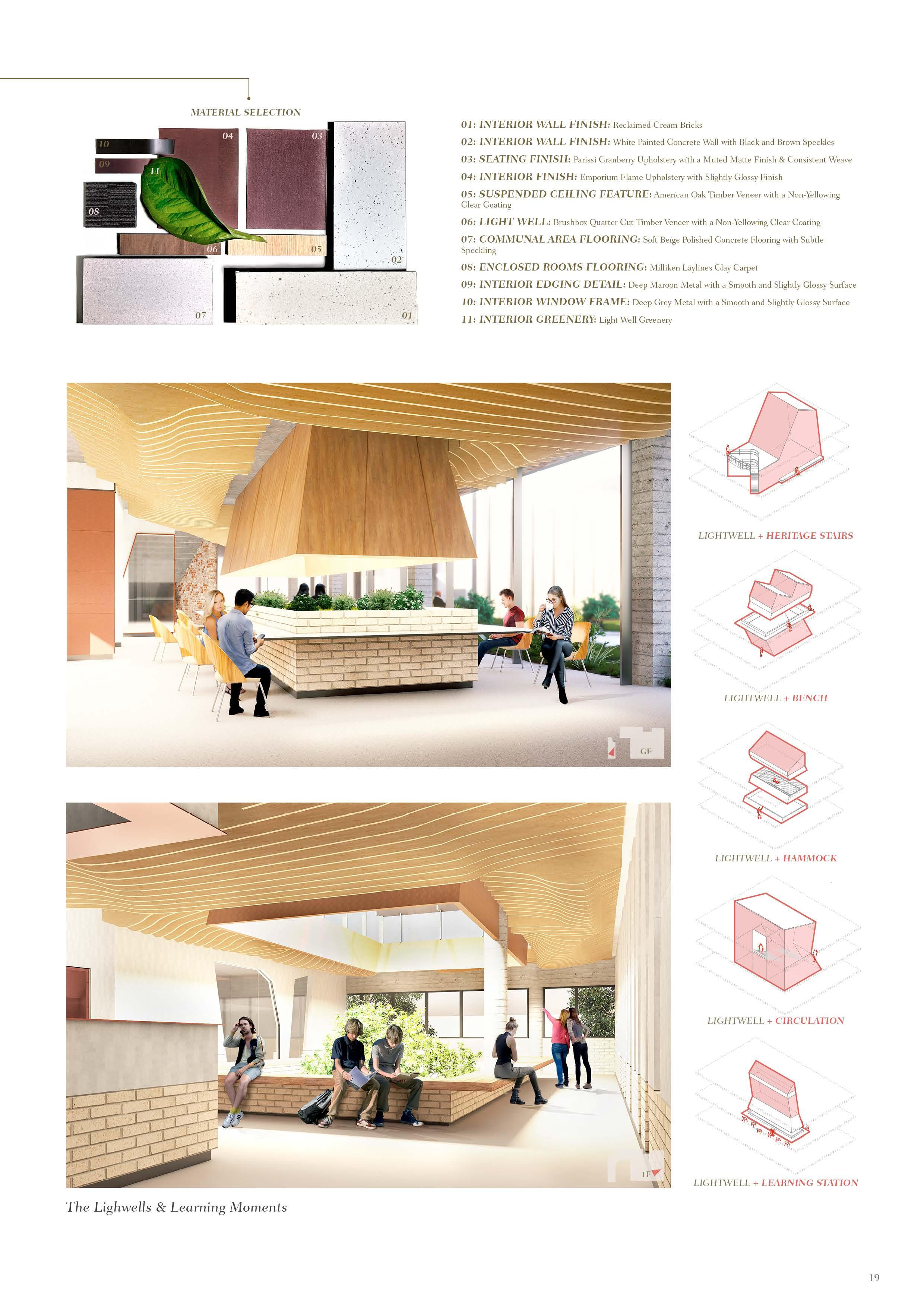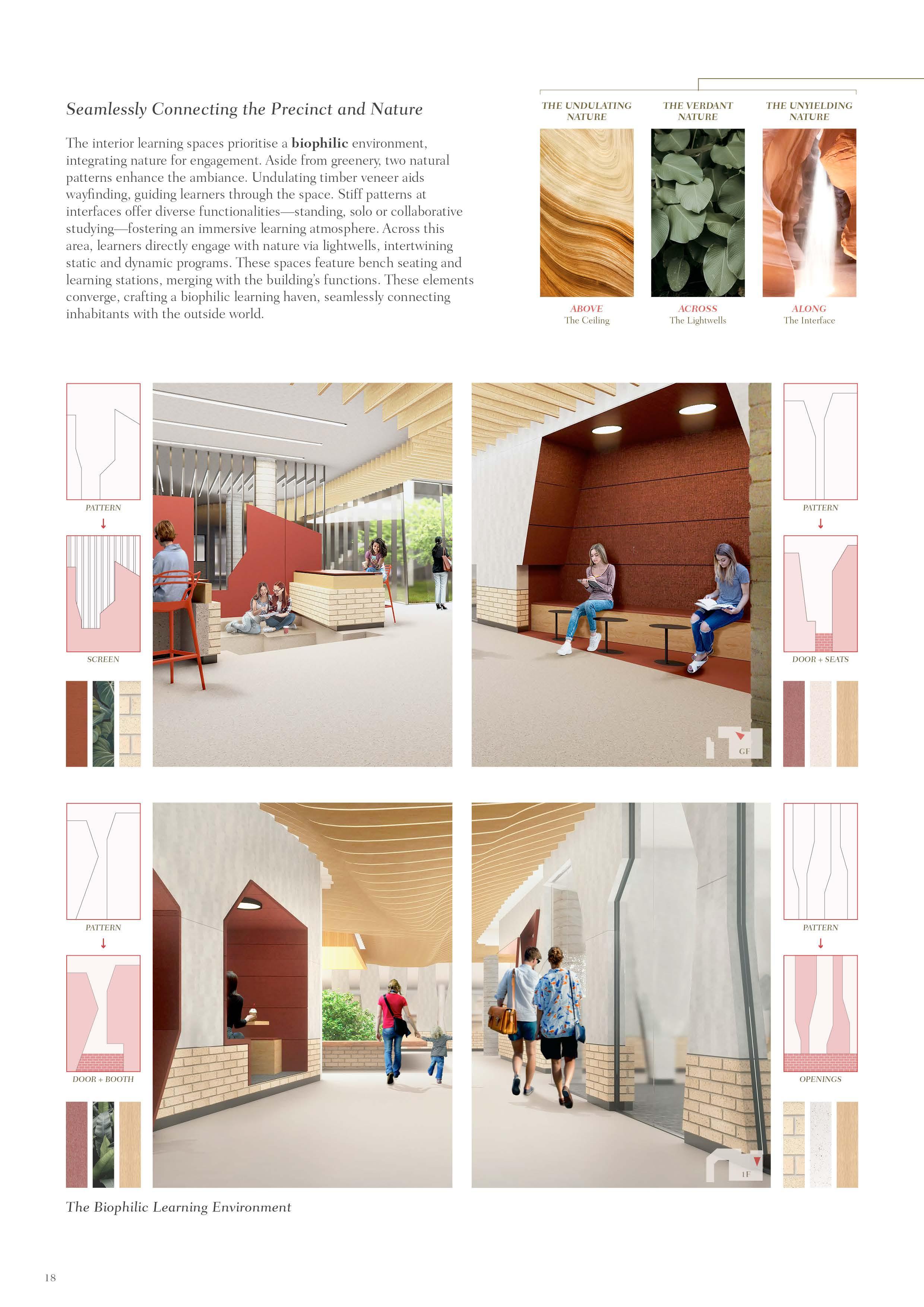 The interior learning spaces prioritise a biophilic environment, integrating nature for engagement. Aside from greenery, two natural patterns enhance the ambiance. Undulating timber veneer aids wayfinding, guiding learners through the space. Stiff patterns at interfaces offer diverse functionalities - standing, solo or collaborative studying- fostering an immersive learning atmosphere. Across this area, learners directly engage with nature via lightwells, intertwining static and dynamic programs. These spaces feature bench seating and learning stations, merging with the building's functions. These elements converge, crafting a biophilic learning haven, seamlessly connecting inhabitants with the outside world.