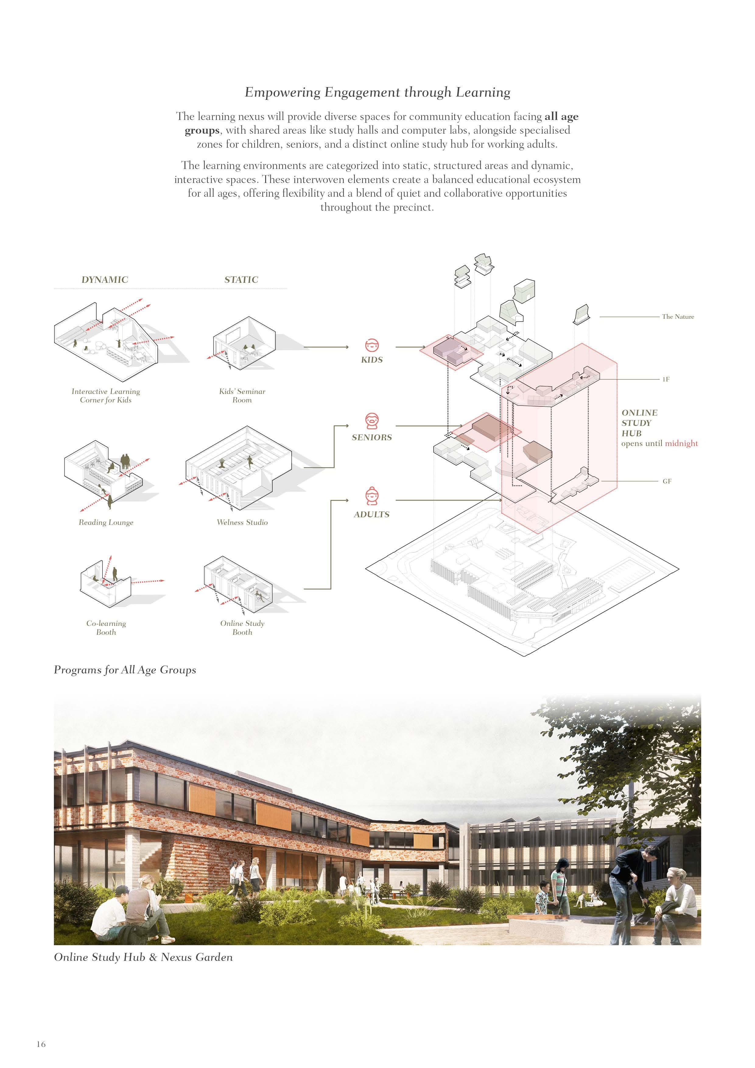 The learning nexus will provide diverse spaces for community education facing all age groups, with shared areas like study halls and computer labs, alongside specialised zones for children, seniors, and a distinct online study hub for working adults.