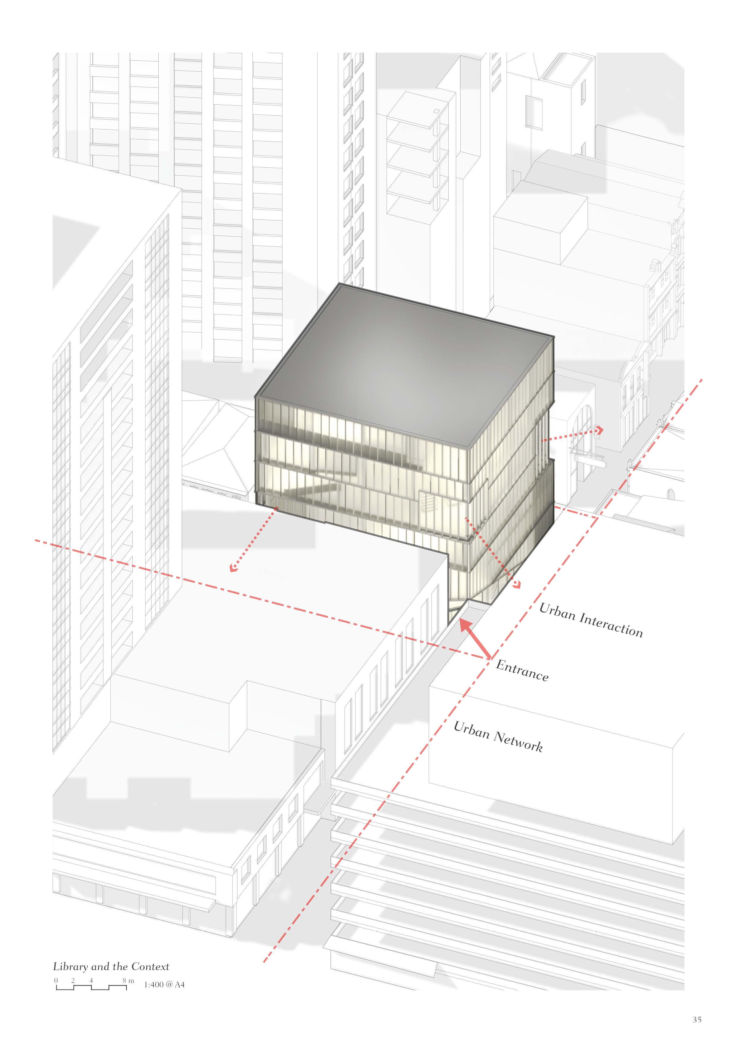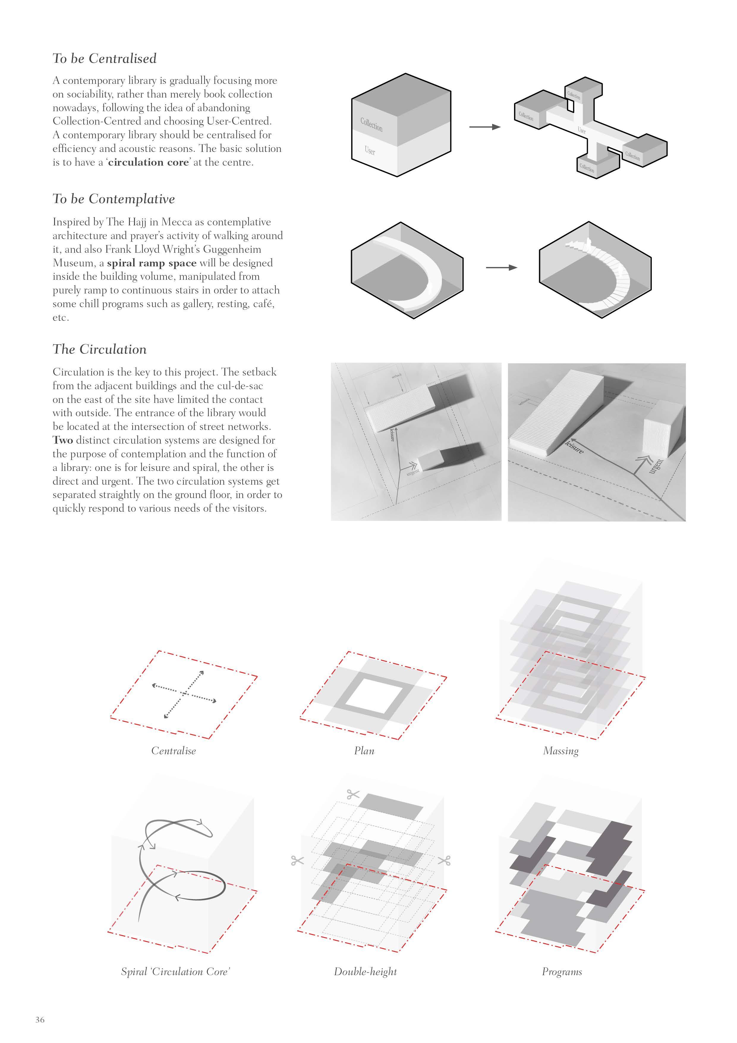 Circulation is the key to this project. The setback from the adjacent buildings and the cul-de-sac on the east of the site have limited the contact with outside. The entrance of the library would be located at the intersection of street networks. Two distinct circulation systems are designed for the purpose of contemplation and the function of a library: one is for leisure and spiral, the other is direct and urgent. The two circulation systems get separated straightly on the ground floor, in order to quickly respond to various needs of the visitors.