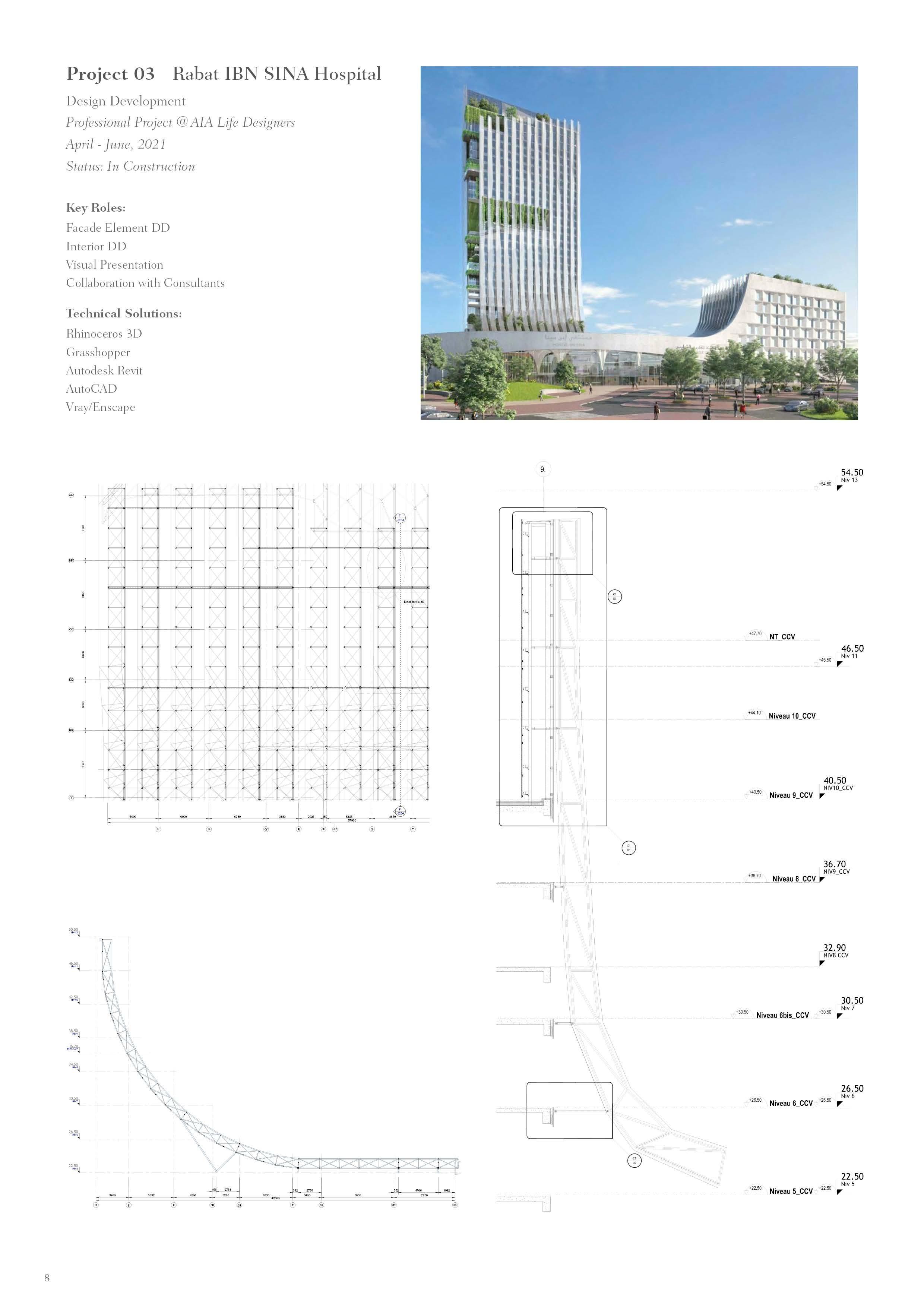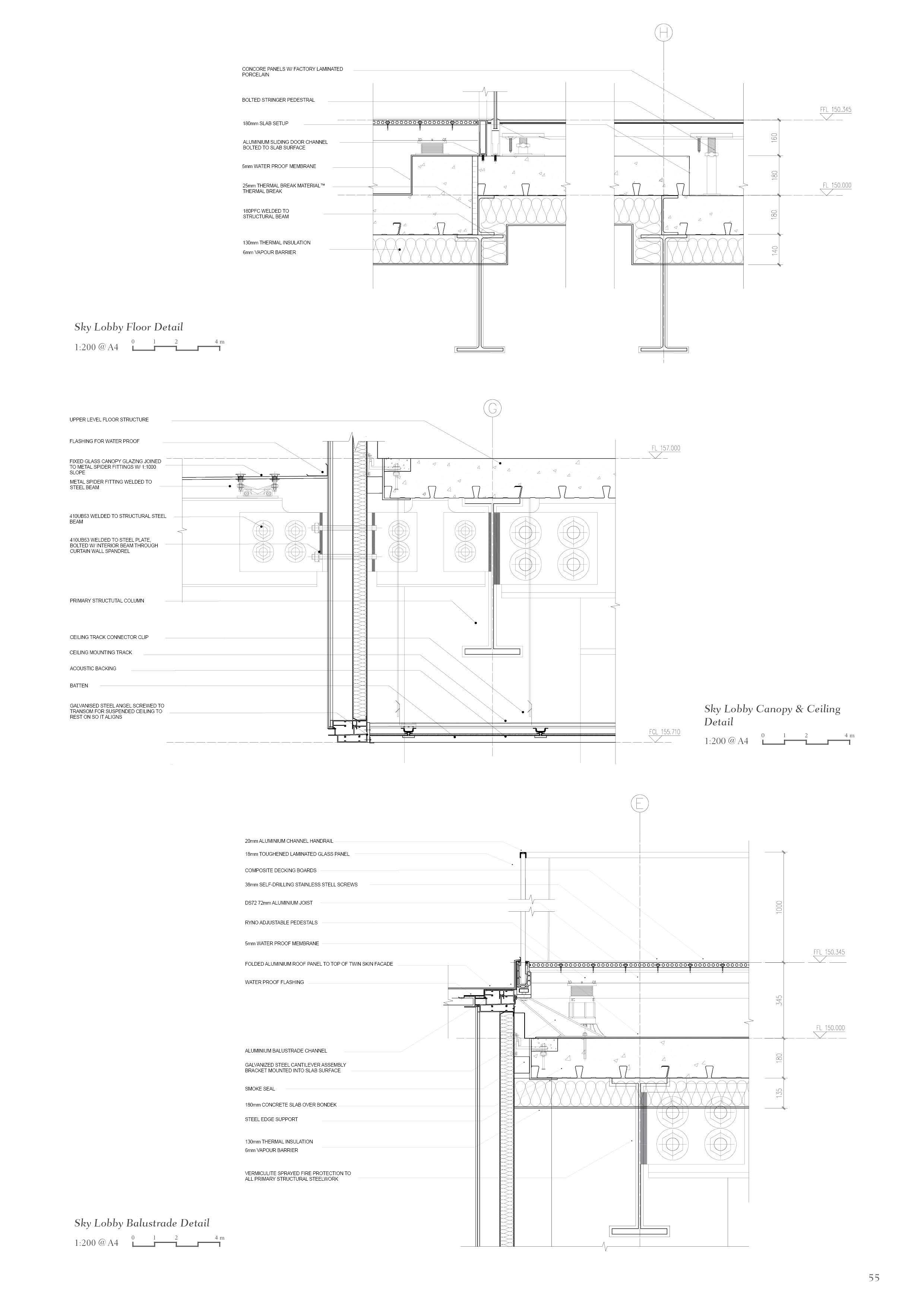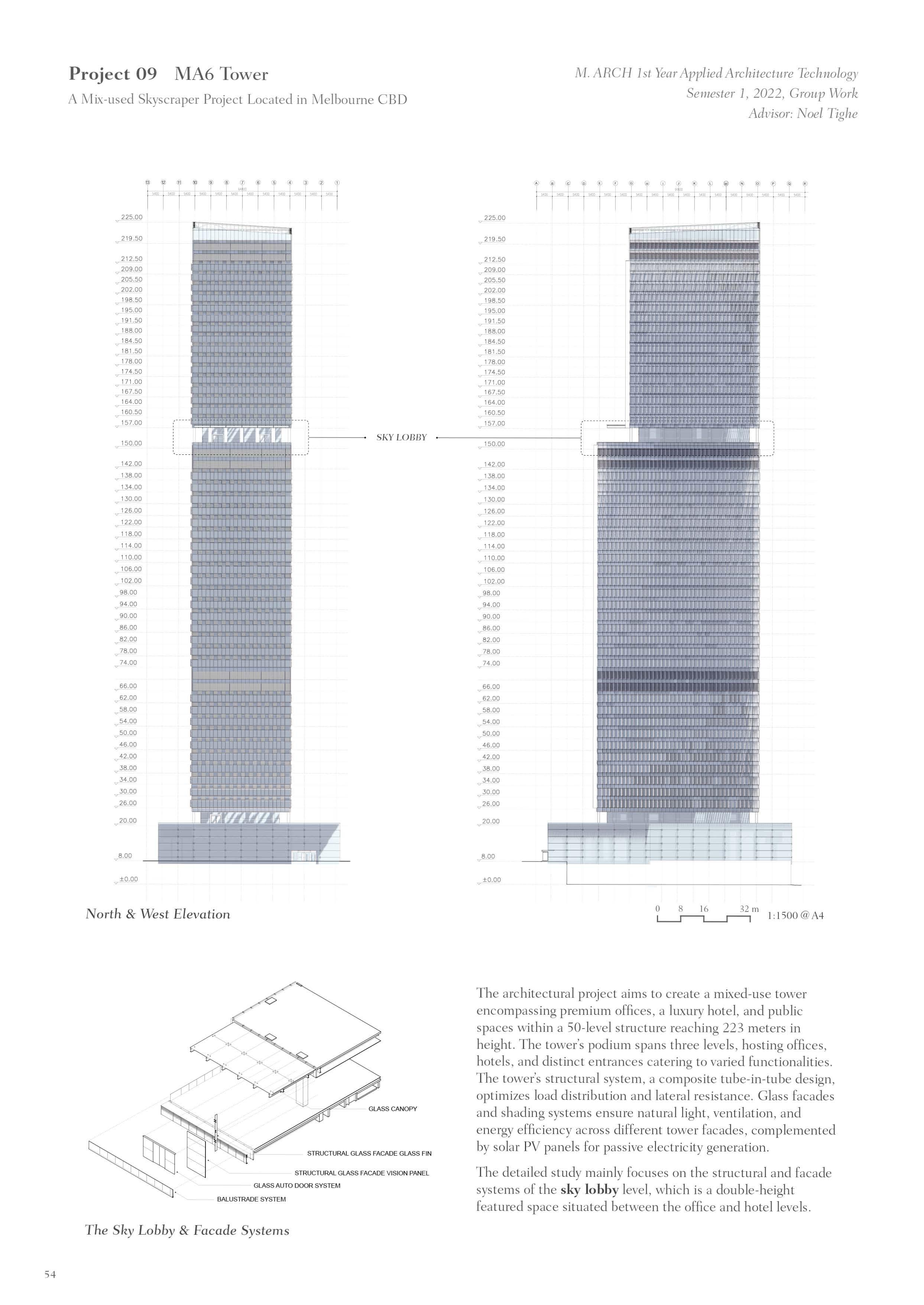 co mp ass in g pre mium o ffi ces, a lux ur y hot e l, a nd publi c spaces w ithin a 50-level st ru ct ure reac hin g 223 meter s in h e ig ht. The to we r 's podium spa n s thr ee leve ls , ho s tin g offices , h o t e ls , a nd di s tin c t e nt ra n ces cate rin g to va ri e d fun c tion a liti es . Th e tower's s tru c tural sys te m , a co mp os ite tub e- i n-tube d es ign , opt imi zes load distributi o n an d latera l res is t a n ce. Glass faca d es and s h a ding sys tem s e n s ure n atura l li g ht , ve ntilation , a nd e n ergy effi c ie ncy across diffe re nt tower facades, comp le m e nt e d b y so la r PV p a nels for p ass ive e lec tri c it y ge n era tion. T h e detailed study m ai nl y focus es o n th e s tru c tura l a nd facade syste m s o f the sky lobby leve l, w hi c h is a double-height featured s p ace situated b e t wee n t h e offi ce a nd hot e l leve ls.