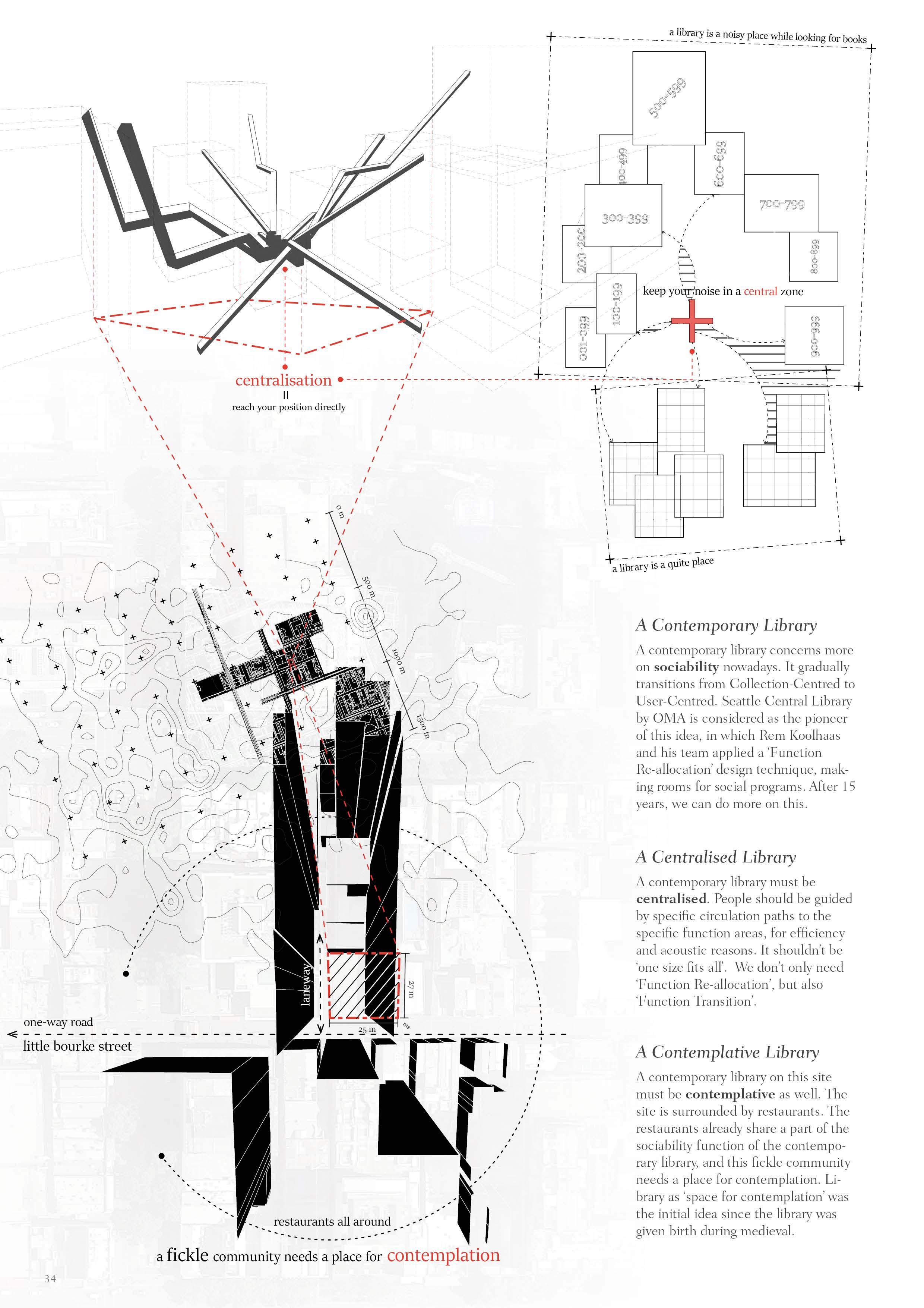 A contemporary library is gradually focusing more on sociability, rather than merely book collection nowadays, following the idea of abandoning Collection-Centred and choosing User-Centred. A contemporary library should be centralised for efficiency and acoustic reasons. The basic solution is to have a 'circulation core' at the centre.