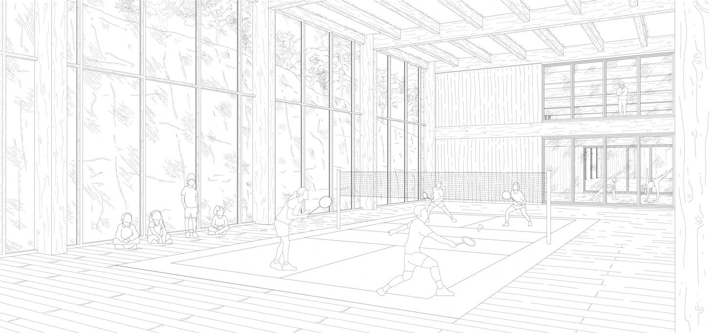 Au milieu de ce nouveau parcours de santé est développé le projet principal, son emplacement est pensé de telle manière à ce que sa toiture praticable se retrouve à fleur avec le sentier. Il se développe tout autour du stade de foot de manière à appuyer un peu plus le caractère central de ce lieu. J’interviens sur trois cotés du terrain, le long d’un affleurement rocheux, autour du terrain intérieur et dans la pente en bord de forêt. Le dernier coté est déjà naturellement fermé par la pente