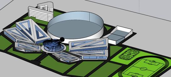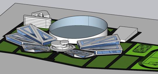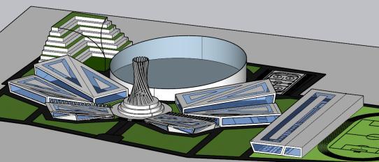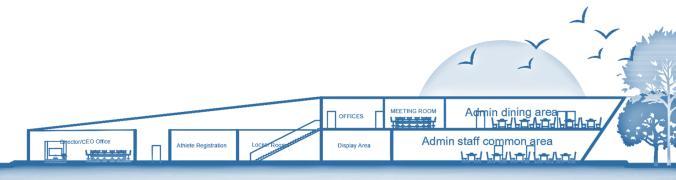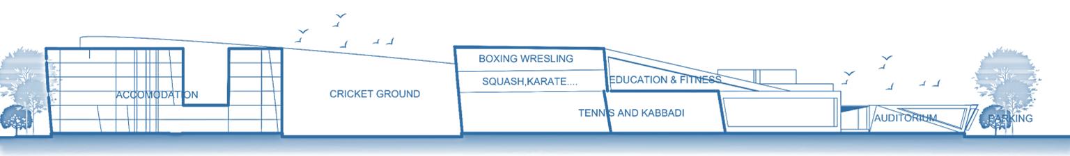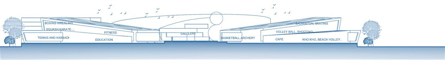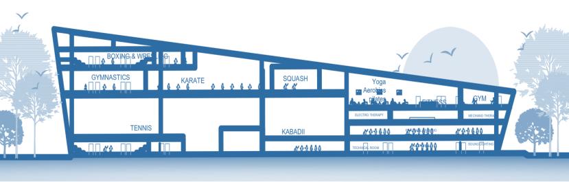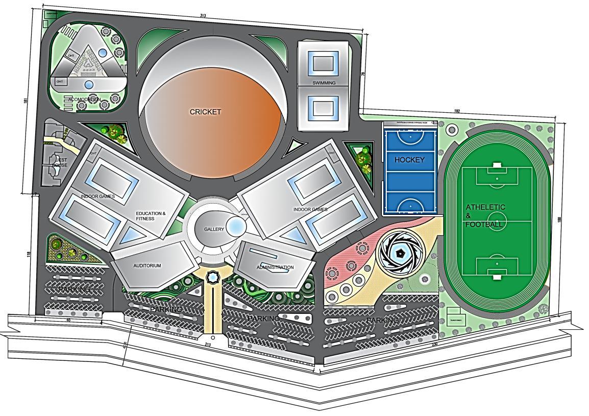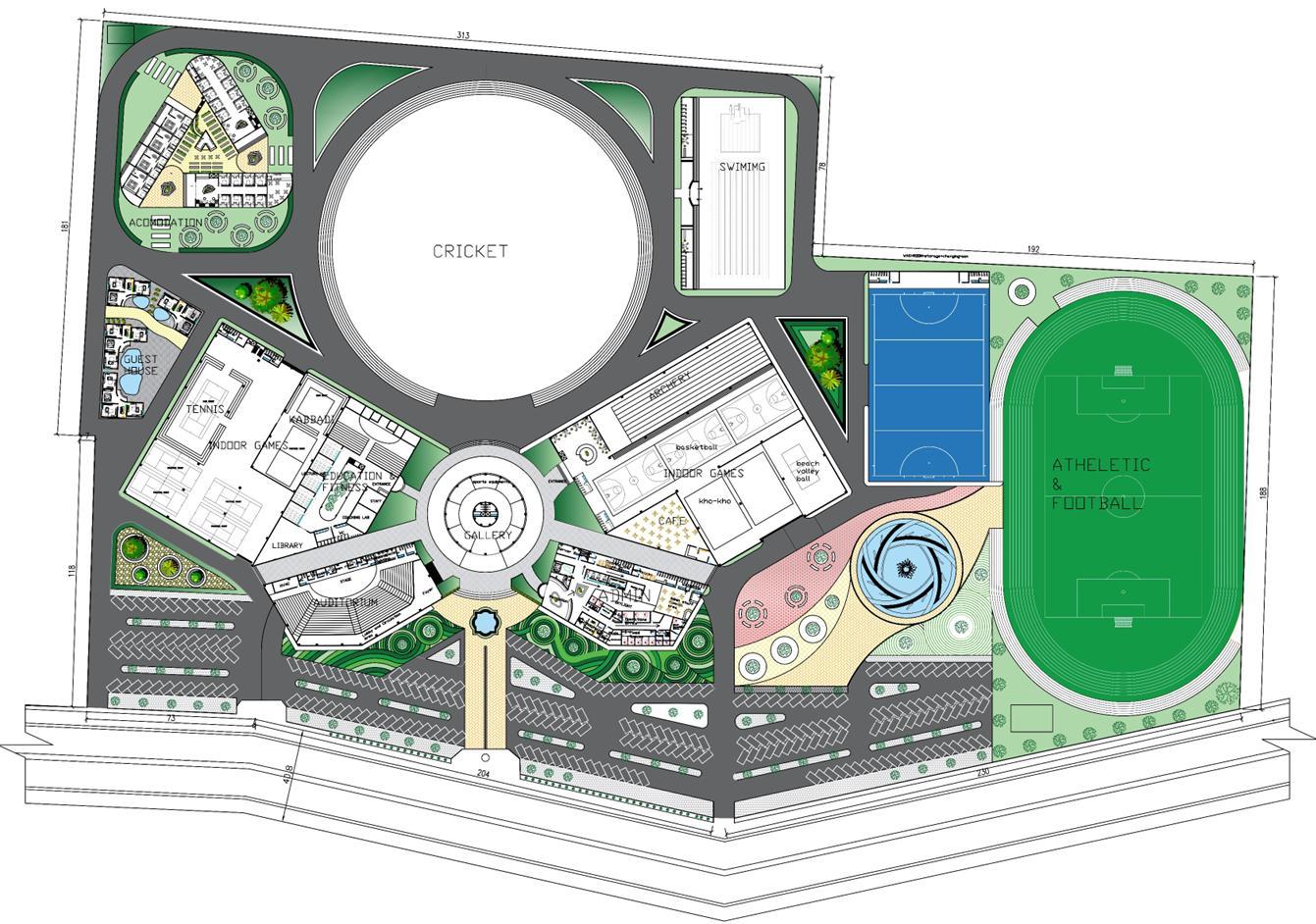 “The Sports Hub(sports nexus) is a premier facility blending training, administration, and fitness with national and districtlevel sports amenities. It features state-of-the-art infrastructure, food courts, cafes, and accommodations to support athletes and visitors. Promoting excellence and inclusivity, it serves as a vibrant center for athletic growth, community engagement, and leisure activities.”