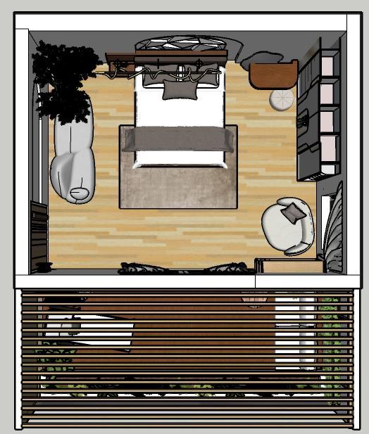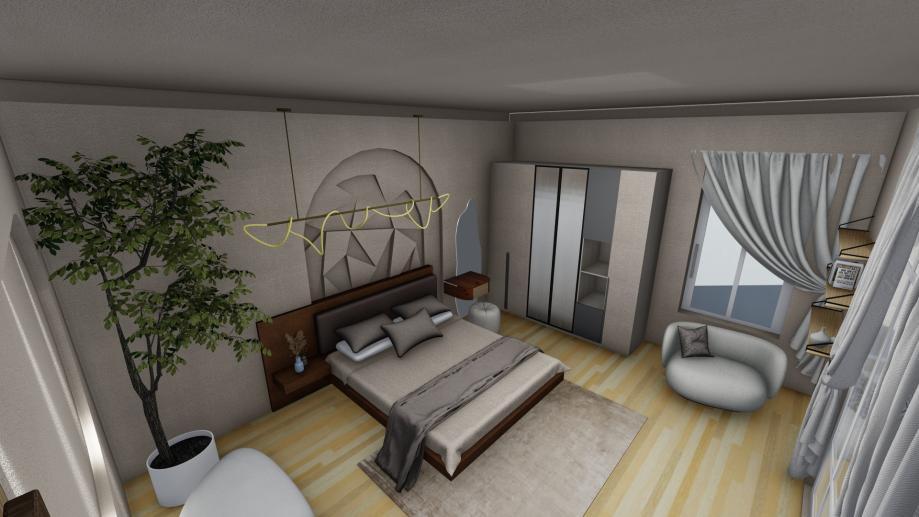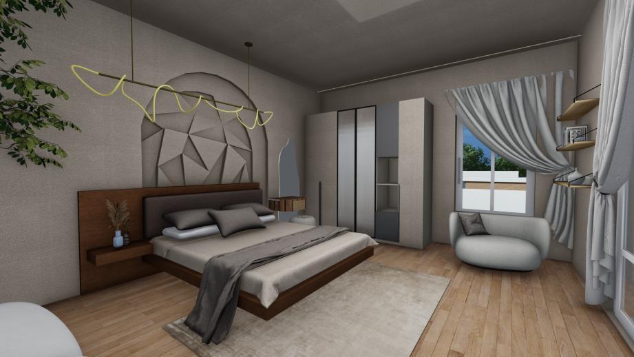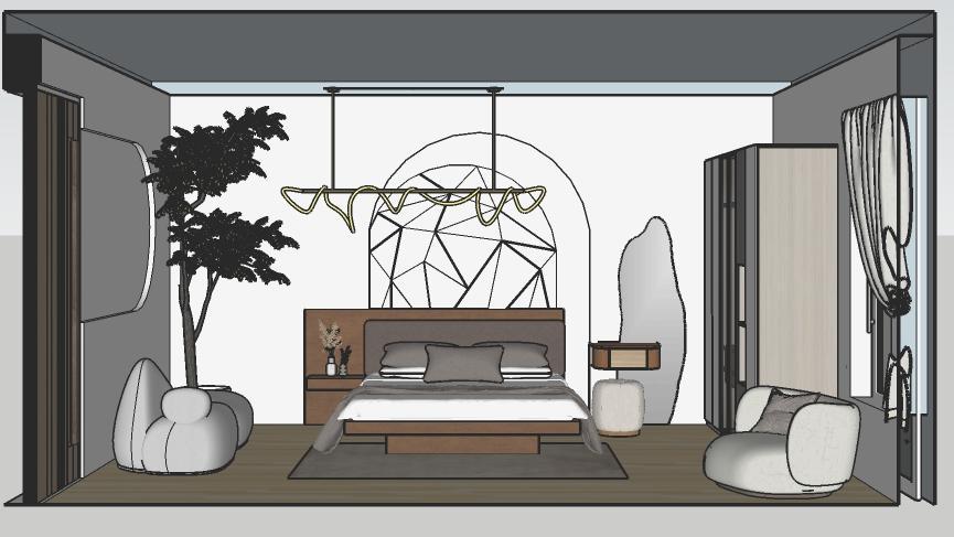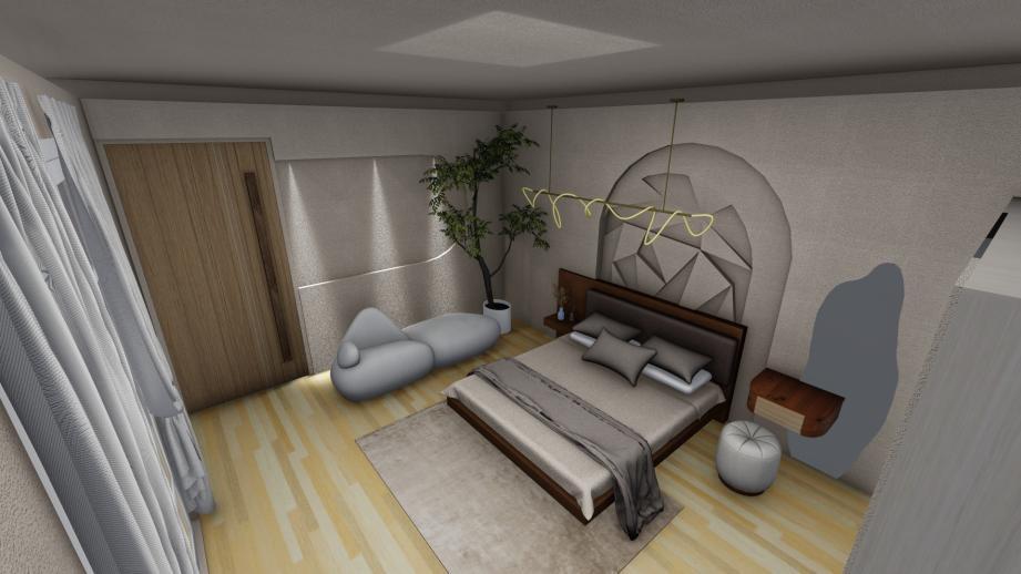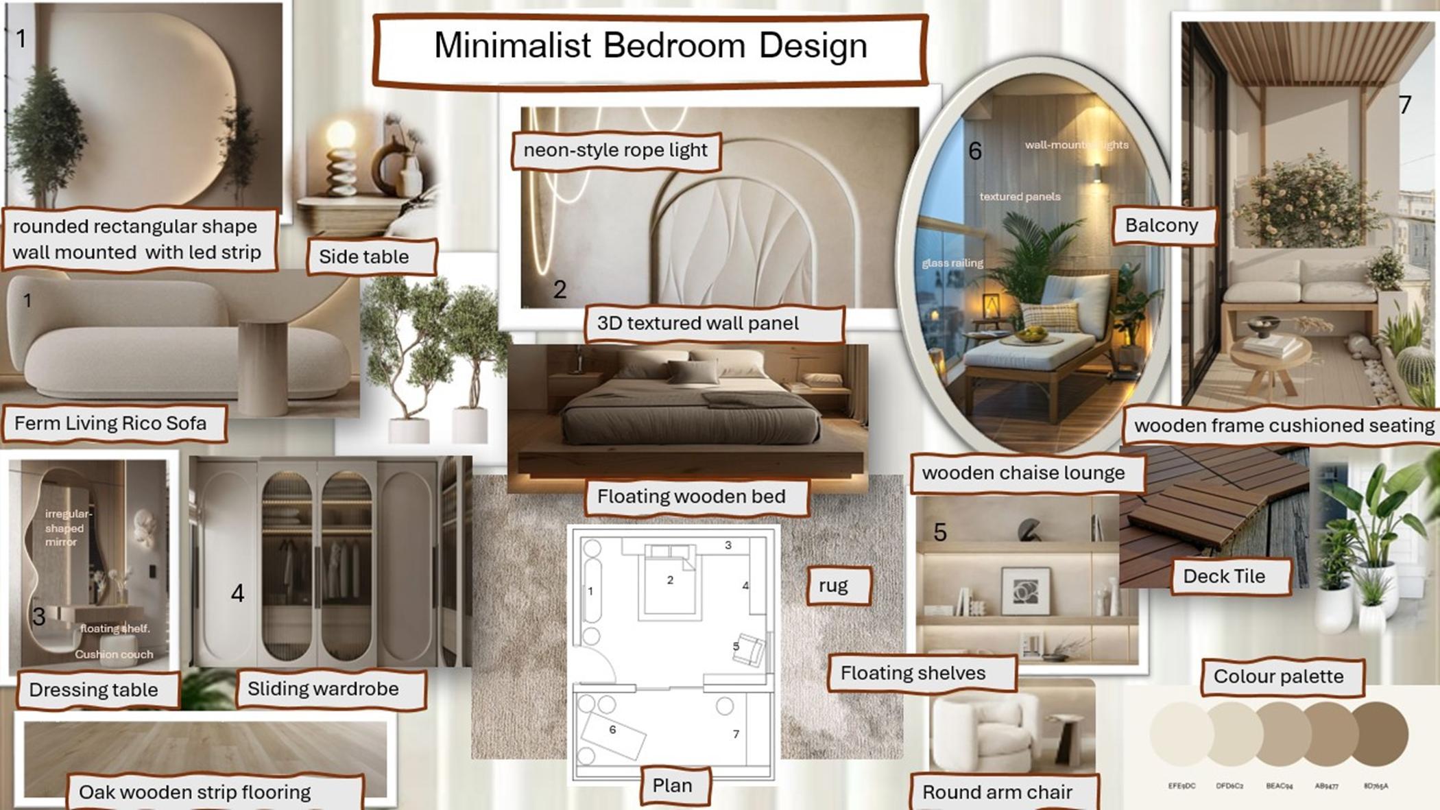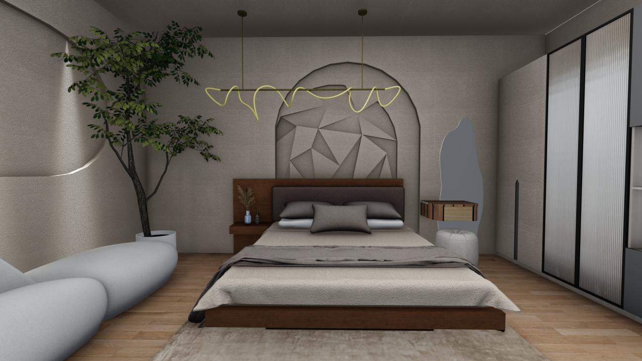"The bedroom's interior design features a striking wall mosaic that adds a modern aesthetic element, complemented by plush Rico sofas for seating, a minimalist wardrobe, a cozy reading nook, a sleek hanging dressing table, and a stylish floating bed frame, all combining to create a serene and sophisticated retreat."