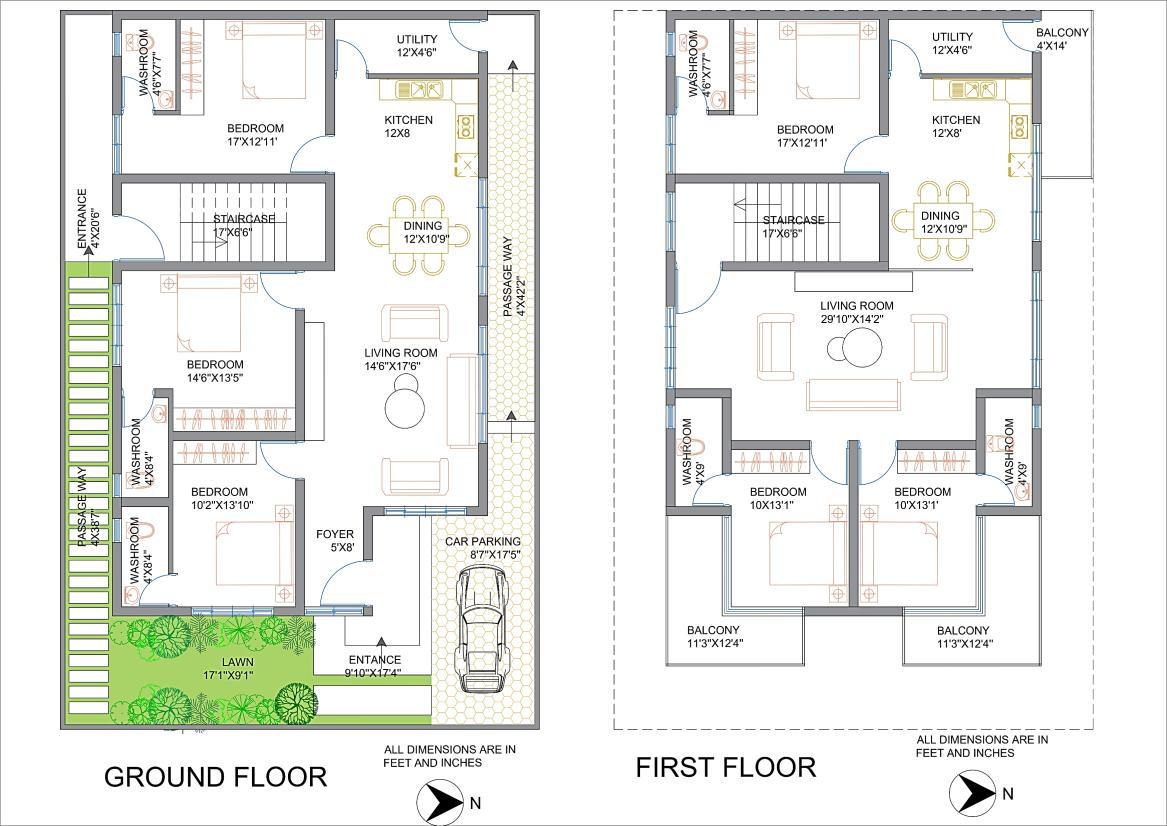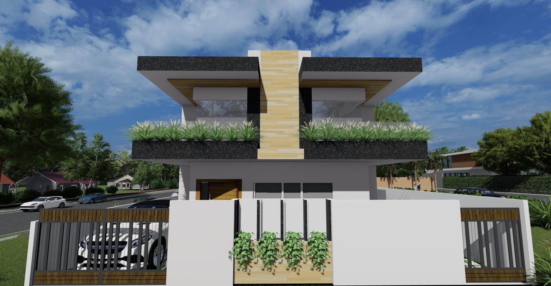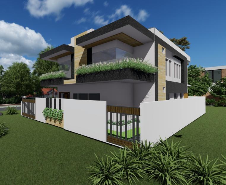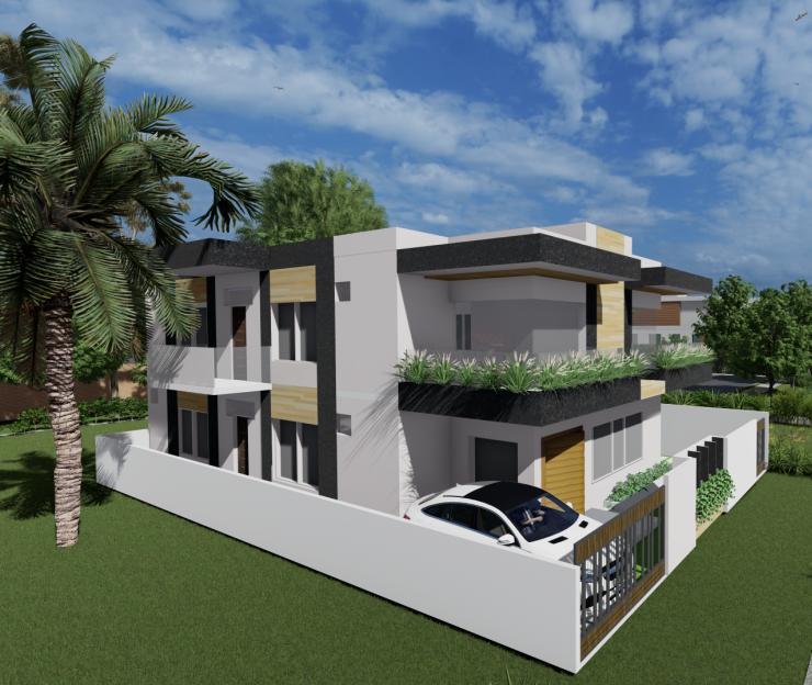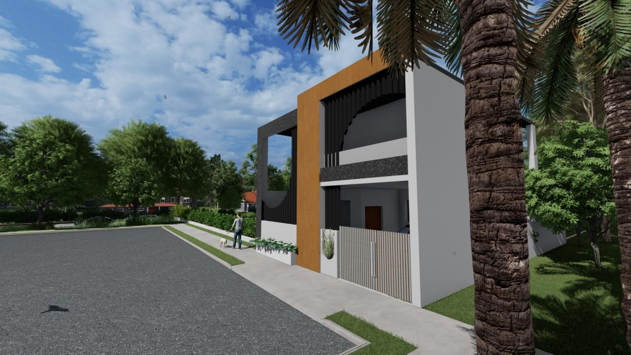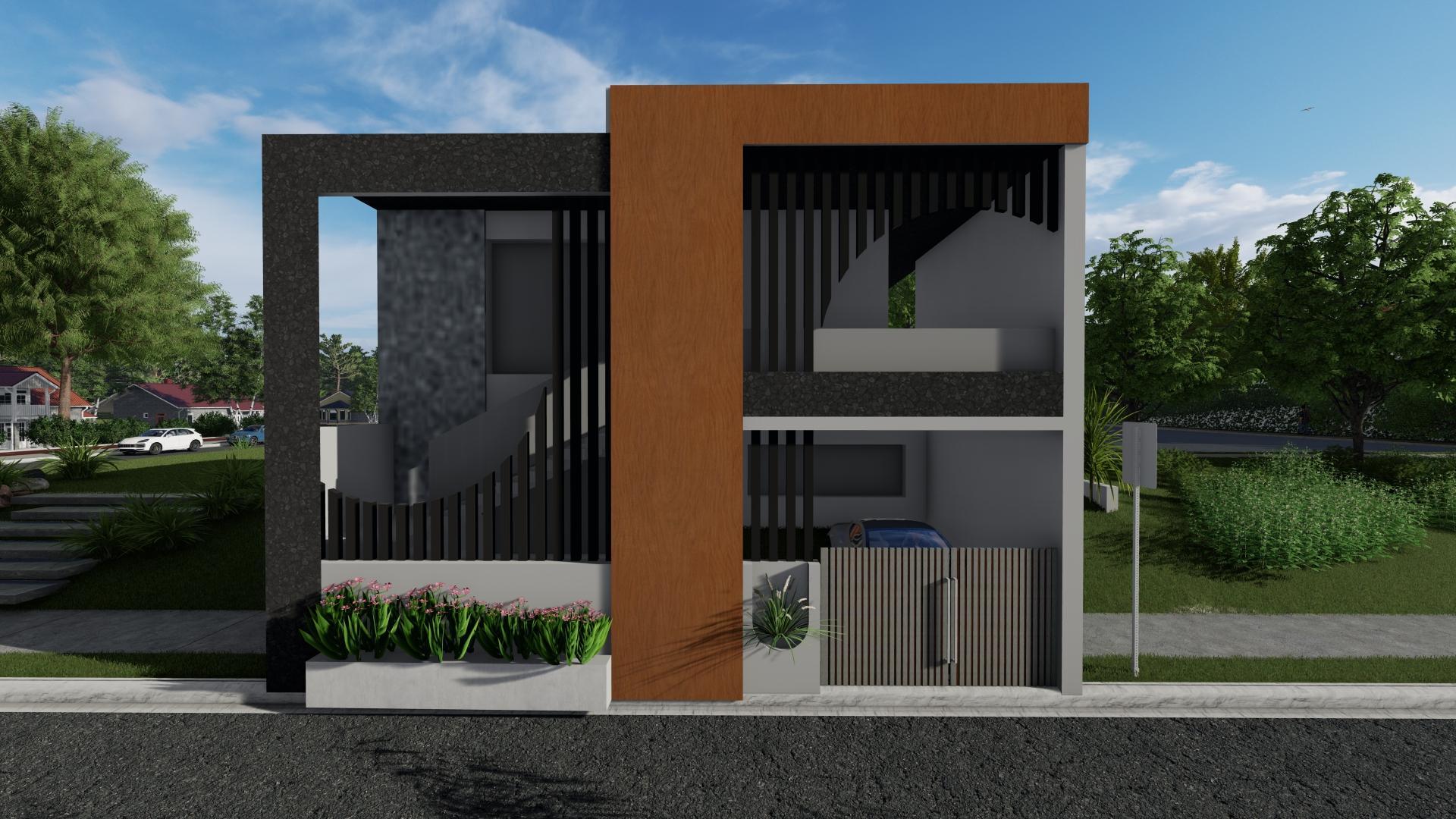“The design features a 3 BHK duplex residence with a ground floor and first floor, featuring a separate staircase providing independent access to the first floor for rental purposes. The design also incorporates a lawn area at the front and a modern elevation as per the client's reference image."