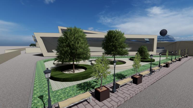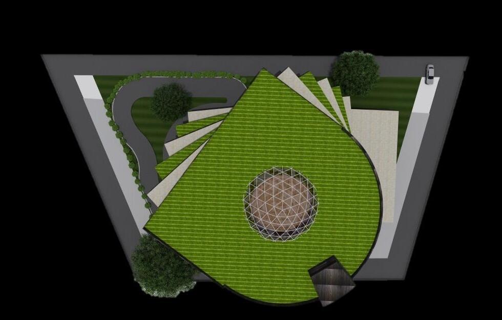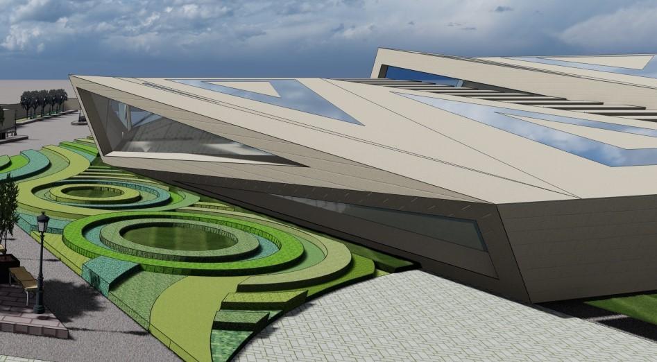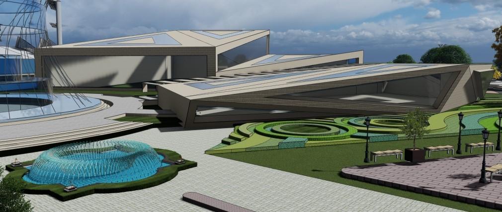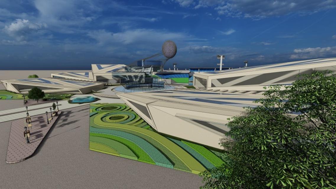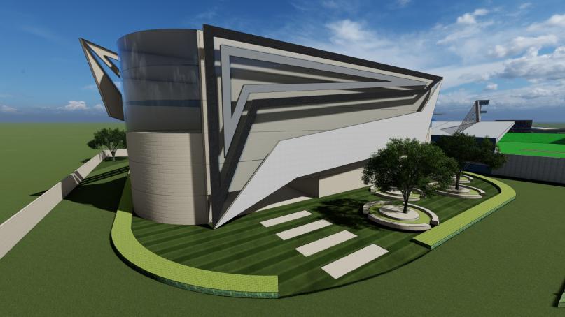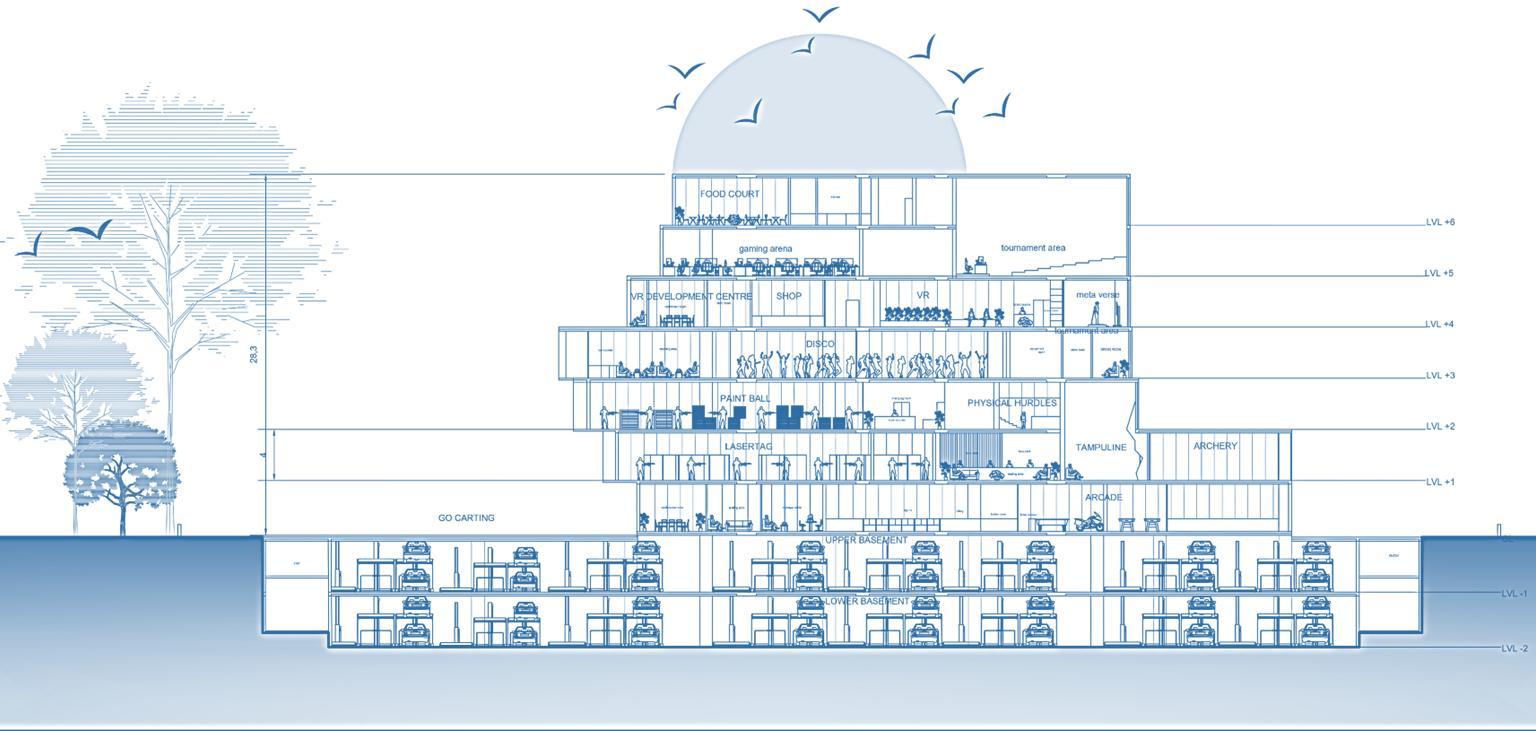 The futuristic gaming complex features a radially developed form, enveloped in a sleek semi-hemisphere design, with a dedicated block added at the ground floor level to accommodate archery and bowling enthusiasts