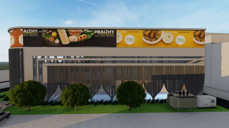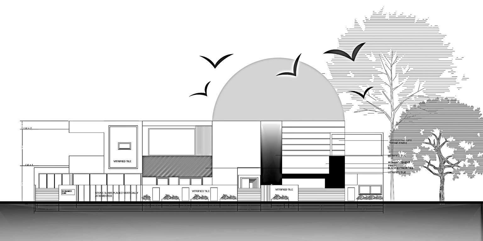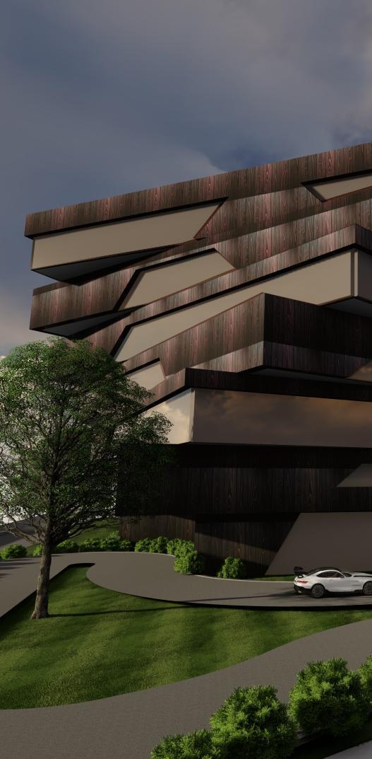 Design concept for the cafe is rooted in the vibrant coffee berry, celebrating the journey of coffee from its earliest stages. Inspired by the berry's colours and forms, the design incorporates elements like honeycombpatterned window cut-outs, filtering natural light and adding warmth. The interior features organic branch-like finishes on walls made with GFRC, while a soothing monochromatic palette ties everything together. Strategically placed leaf-like structures shield the space from harsh sunlight, protecting lush vegetation and creating a serene ambiance, where nature and architecture blend seamlessly