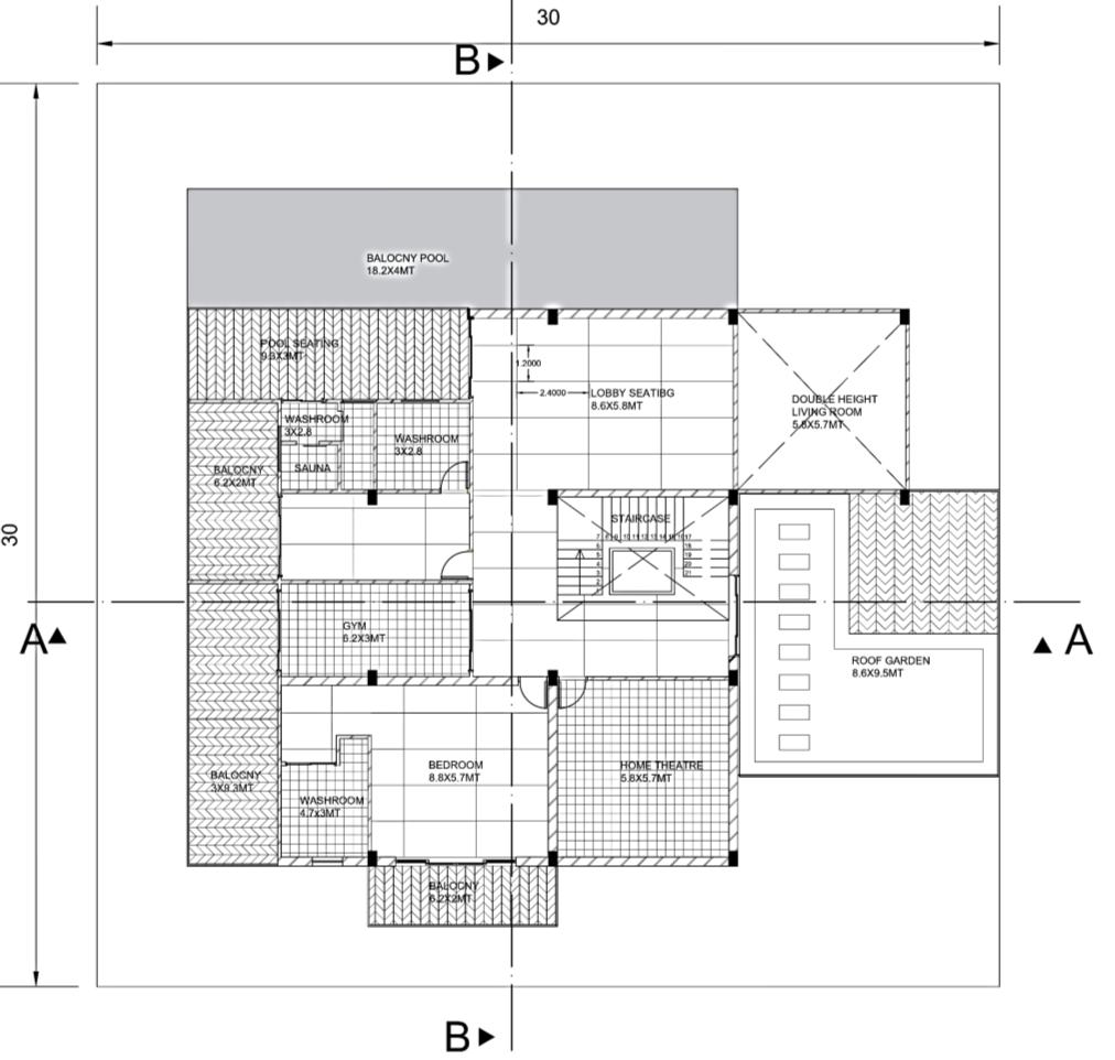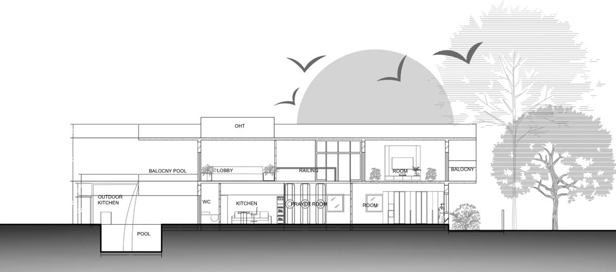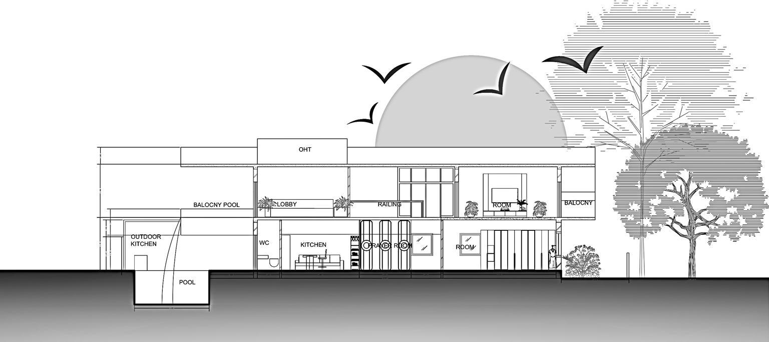 The high-density housing development is zoned to optimize natural light, featuring north-facing building surfaces for enhanced illumination. Strategic placement of housing units ensures optimal views of the pool and garden, enhancing residents' living experience. The basement is positioned according to the natural topography, leveraging the lowest points to create efficient and functional space