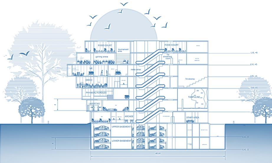 Visual connectivity plays a vital role in drawing customers in and enticing them to explore and play various games. To capitalize on this, the atrium is equipped with a capsule lift that provides a seamless visual connection throughout the surrounding area.