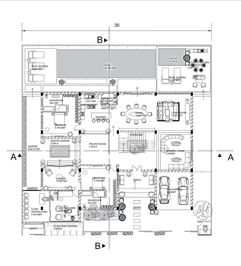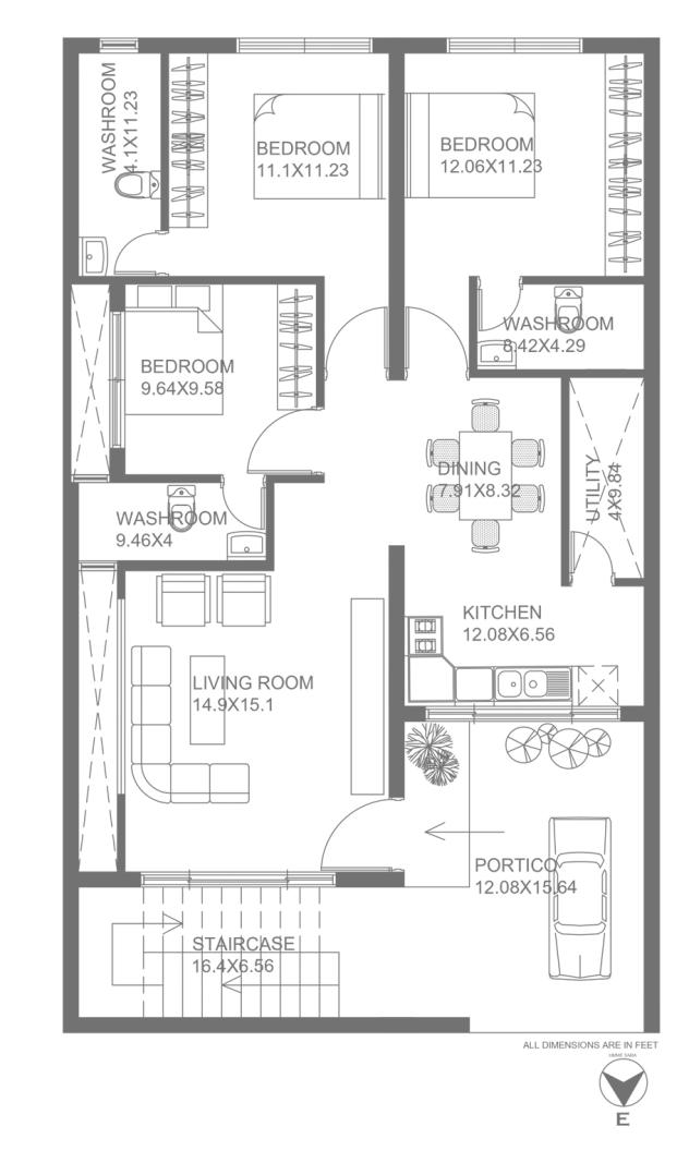 "As per the client's request, I have designed a 3 BHK ground floor plan with a separate staircase leading to the first floor, reserved for future construction, accompanied by a sleek and modern elevation that embodies minimalist elegance."
