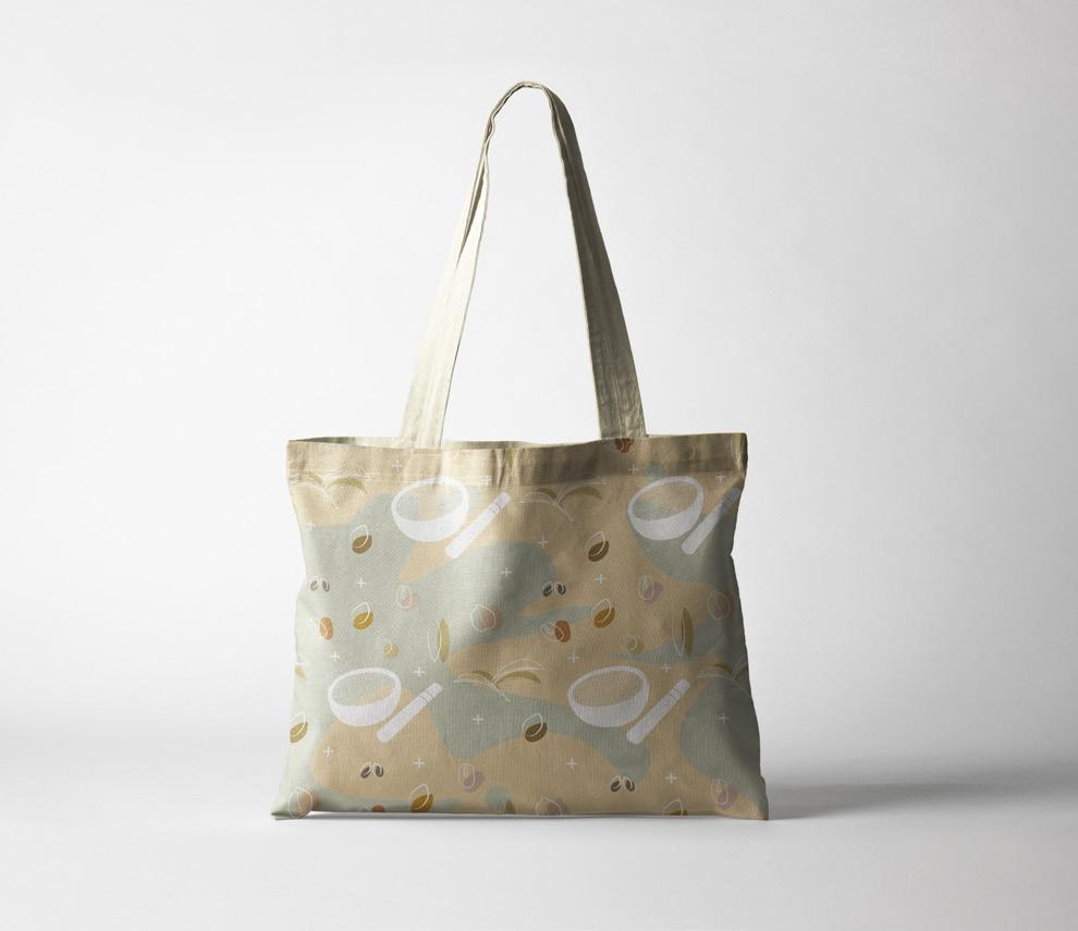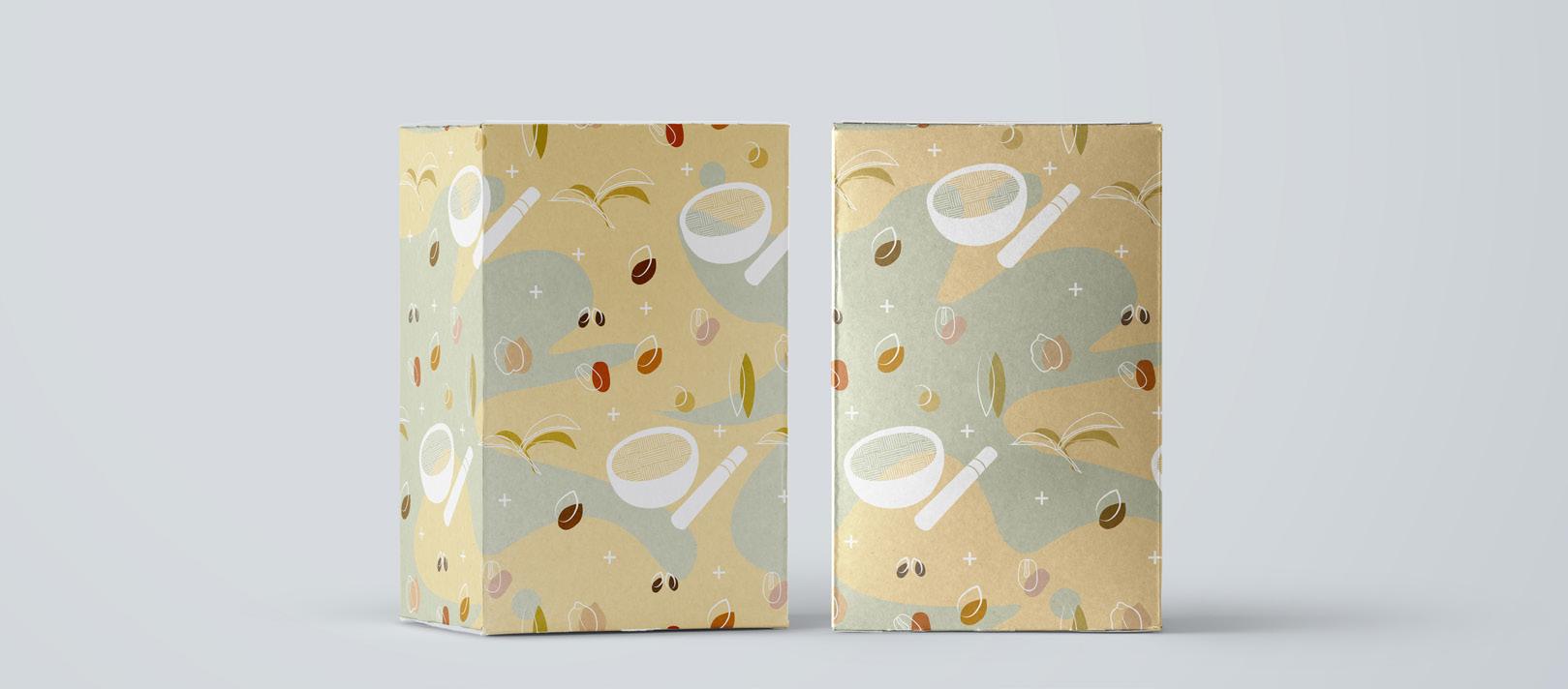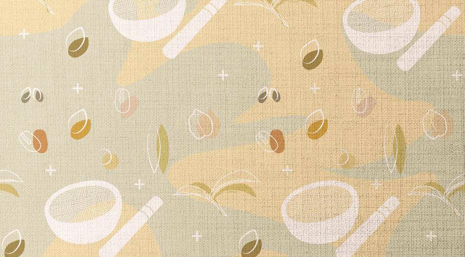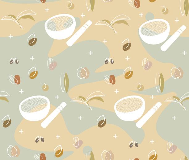 以客家文化的擂茶發想,選用茶葉與果實,用 色塊與線條去構成。