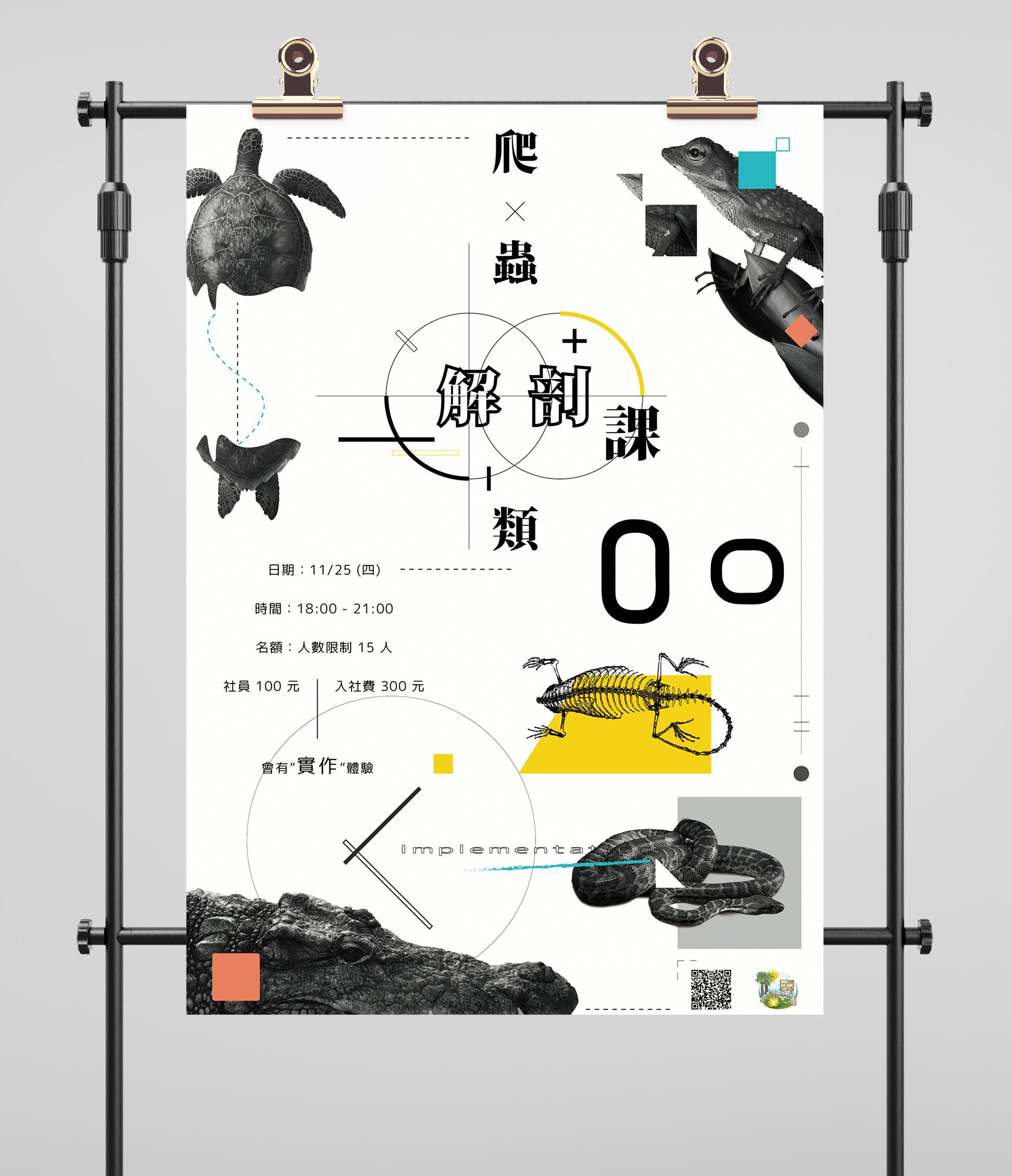要求有四種爬蟲類,以不同的「解剖」方式 來表現,抽色後再加上色塊,避免整張海報 的顏色過於複雜。