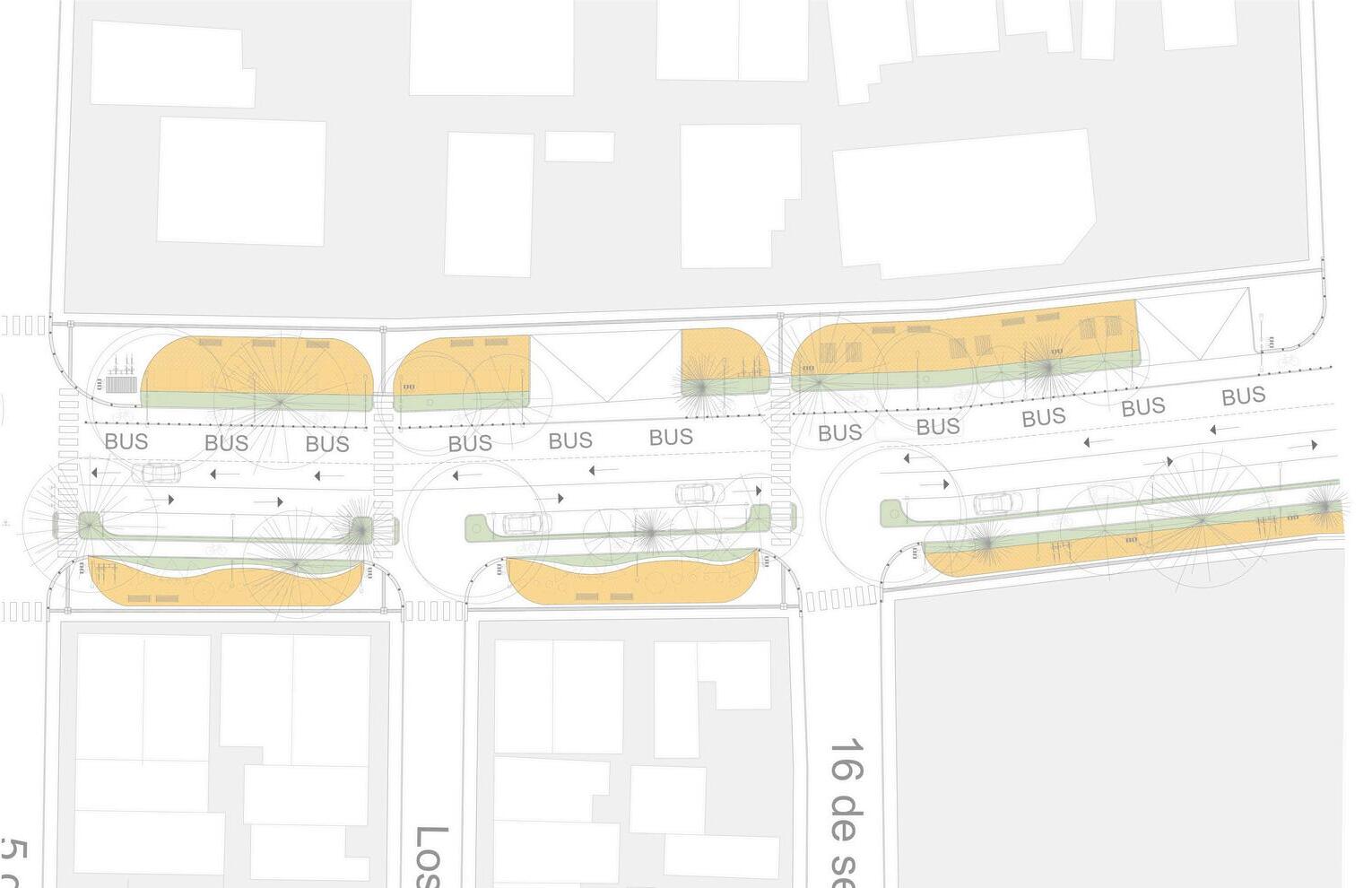 La zonadetransición conserva banquetas, camellón central, ciclovía protegida y estacionamientos, reduciendo a un carril el sentido sin ruta de autobús e incorporando cruces peatonales nivelados para mejorar la conexión. La zonadepermanencia, destinada a jóvenes y adultos, integra mobiliario urbano y cruces seguros, creando un espacio cómodo, accesible y propicio para la socialización.