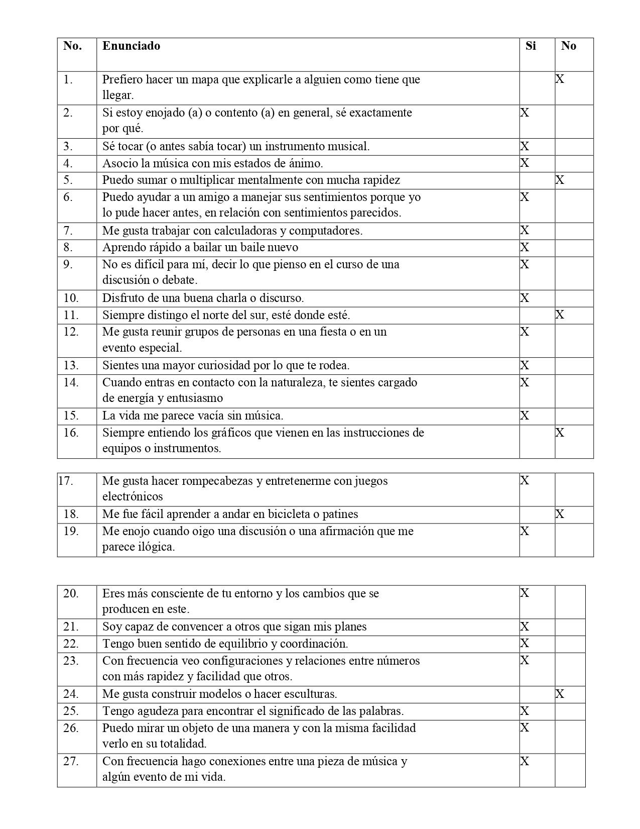 Al participante le gusta hacer cálculos mentales con mucha rapidez, además menciona que su juego de mesa favorito es el ajedrez; pero lo que más destaca es la Inteligencia musical/rítmica, ya que desde pequeño le gusta tocar instrumentos musicales, llevar el ritmo y recuerda con lucidez las melodías.