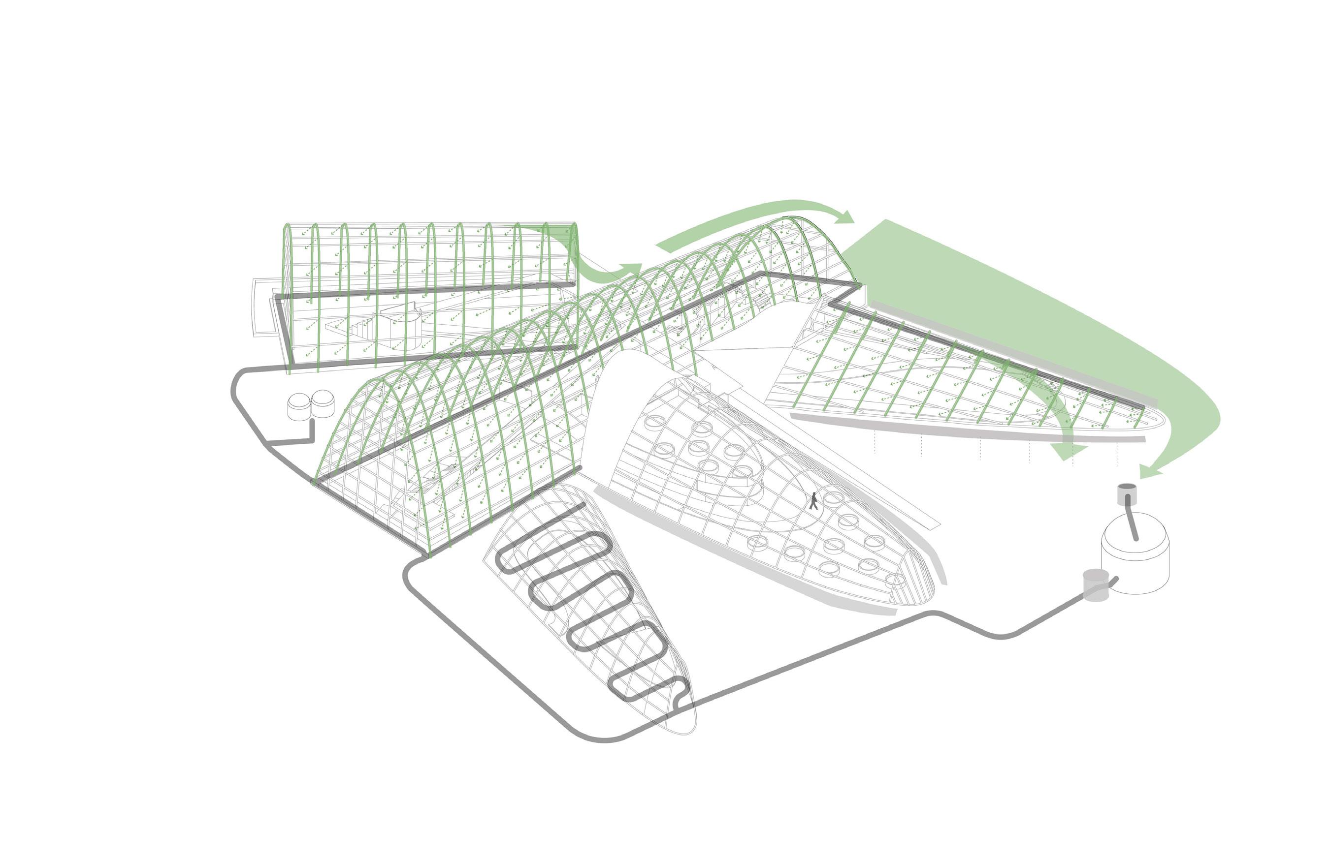 Features: Gravity based filtration with a 5,000 gallon cistern. The stored water is pumped back into the building water supply to water the plants and flush the toilets. Proposed Gutters around exterior of all buildings to flow into Cistern Pump Water to flow back into community garden and existing greenhouses to water the collections Flow from stormwater Underground Filtration Unit Pump 5K Gallon Cistern Existing 3k Gallon Cistern and overflow tank Greywater for Greenhouse Plants & plumbing 1 2 4 3 5 6 6 7 7 5 3 4 2 1 BIOCLIMATE AND RAINWATER COLLECTION Existing water pipes housed within parabolic structure