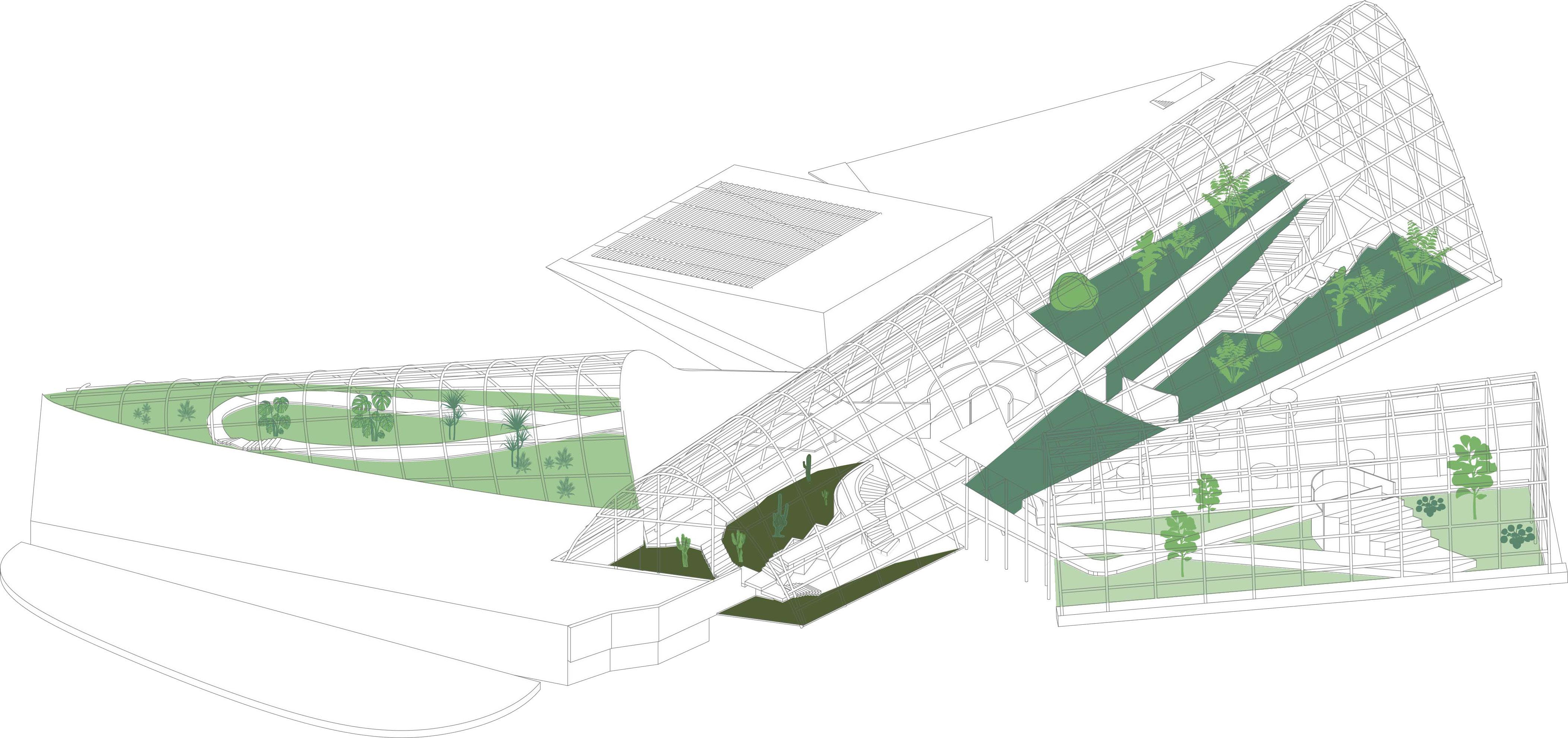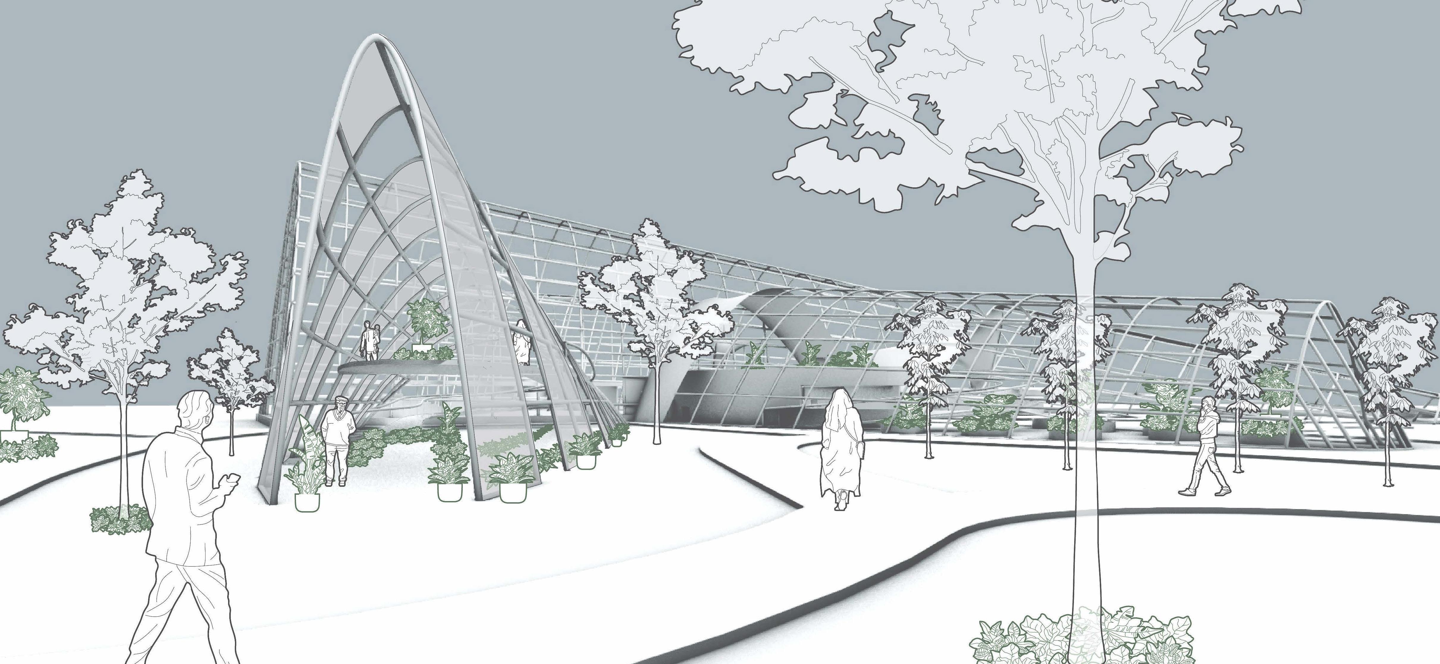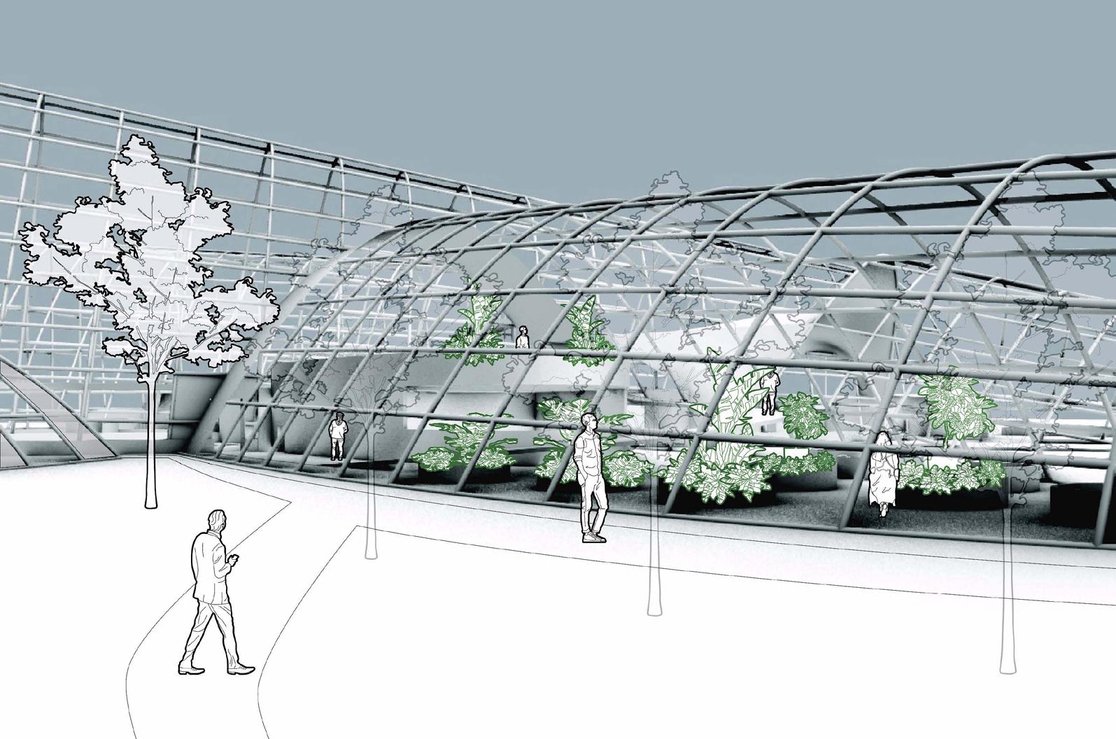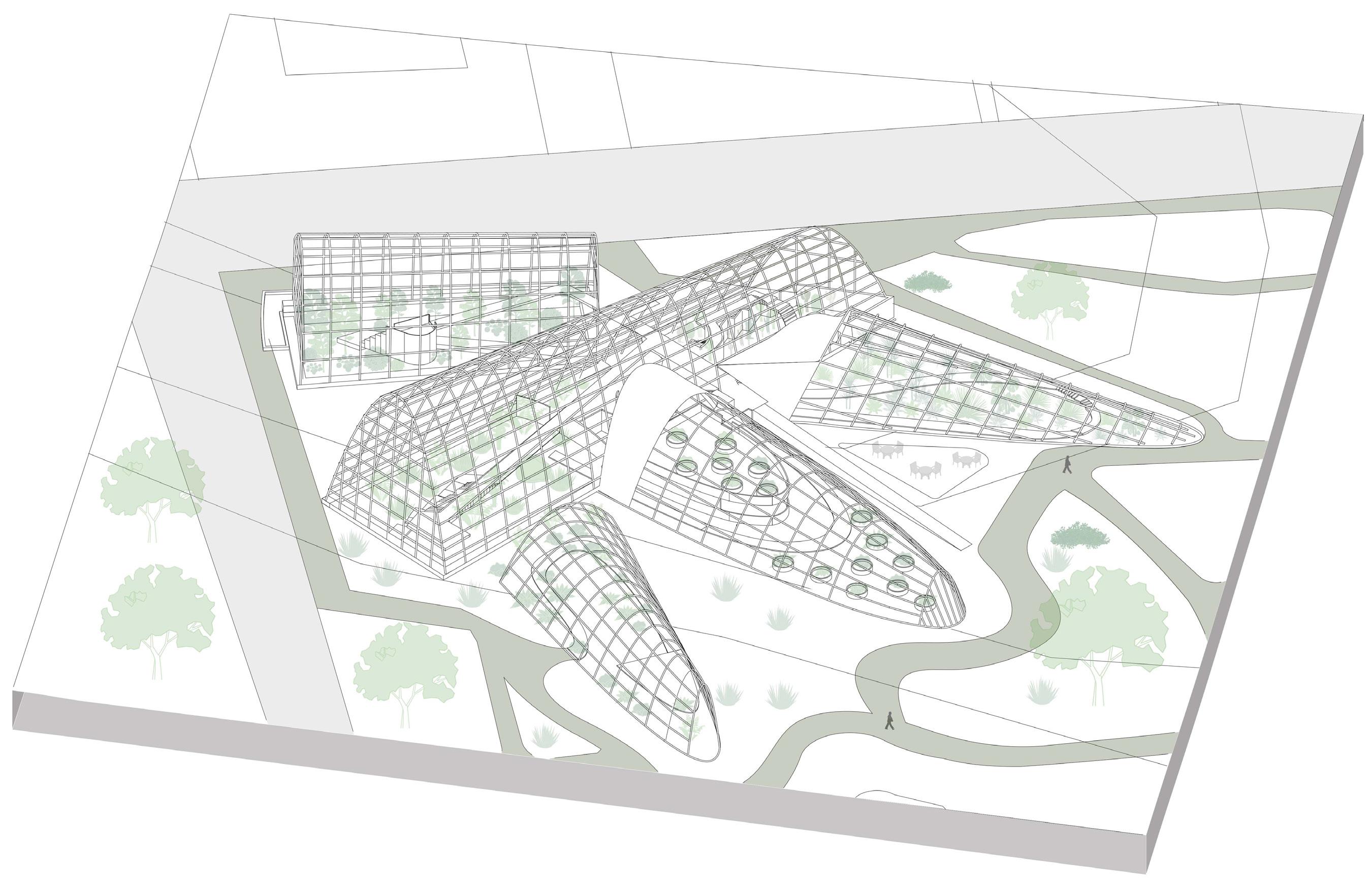 The goal of our expansion and adaptation is to integrate the new buildings with the existing ones while improving the technology and innovation of the new structures. Since the existing botanical garden is located at a University, we decided to incorporate a community garden as the complementary program.