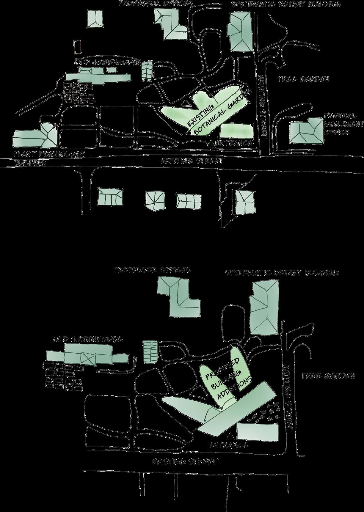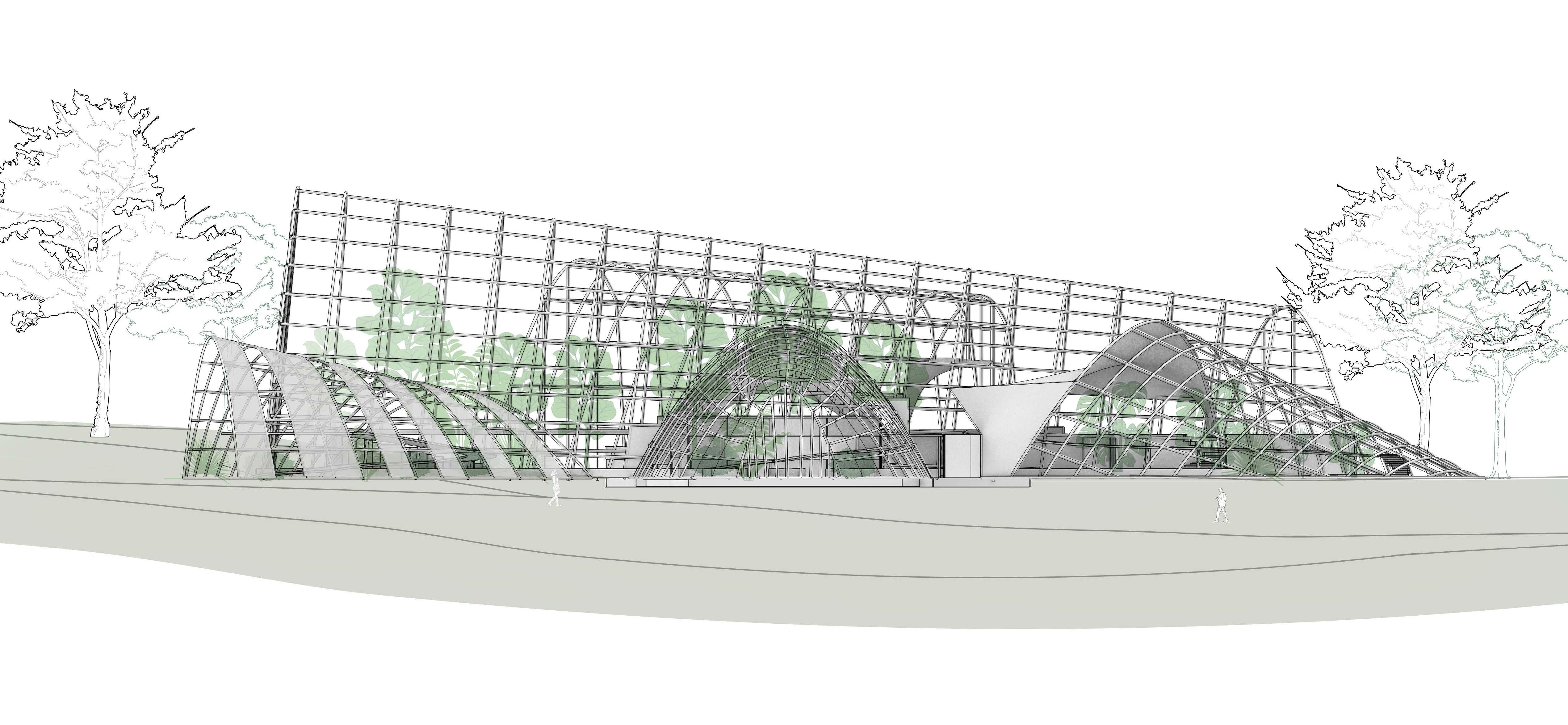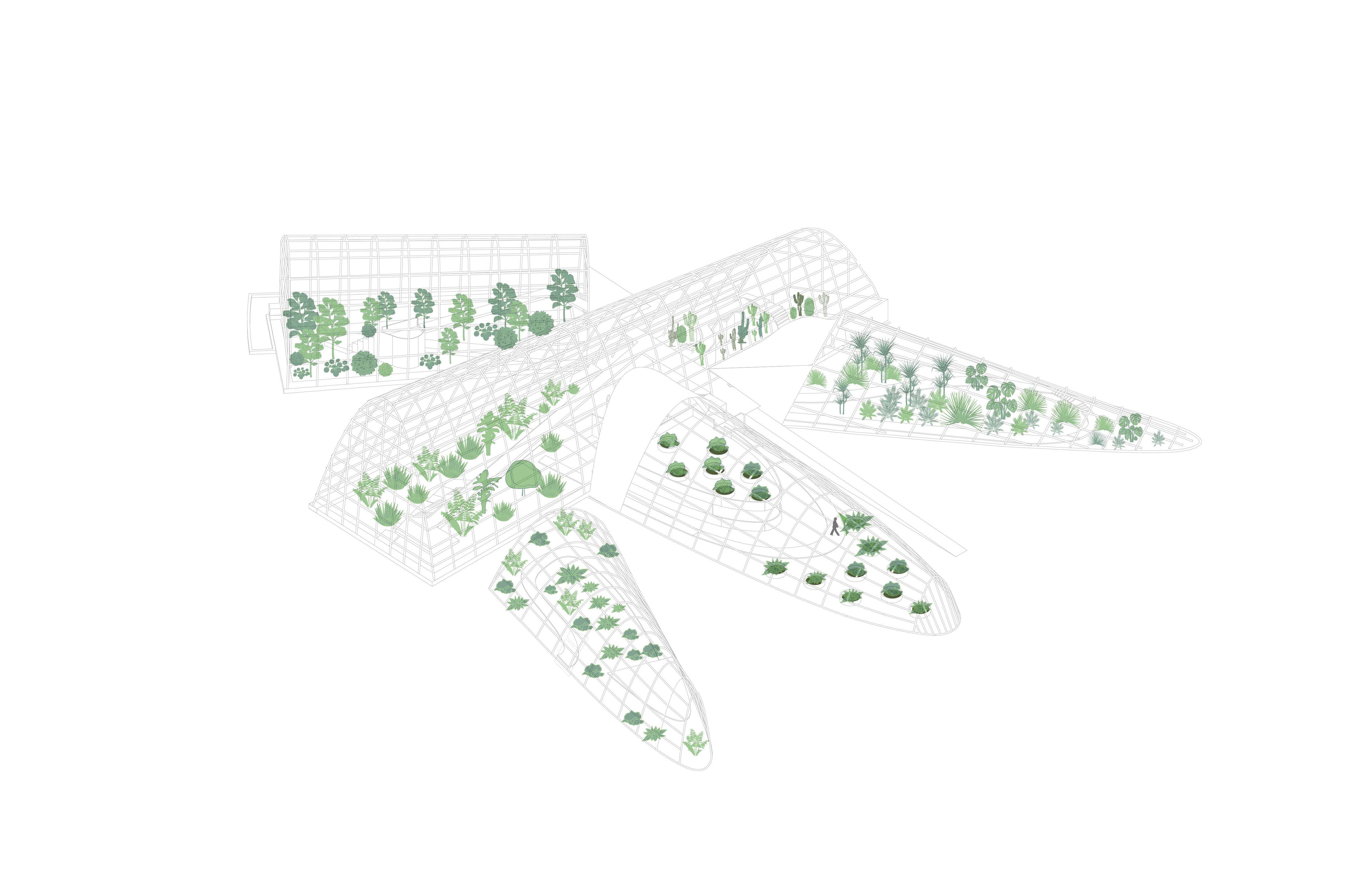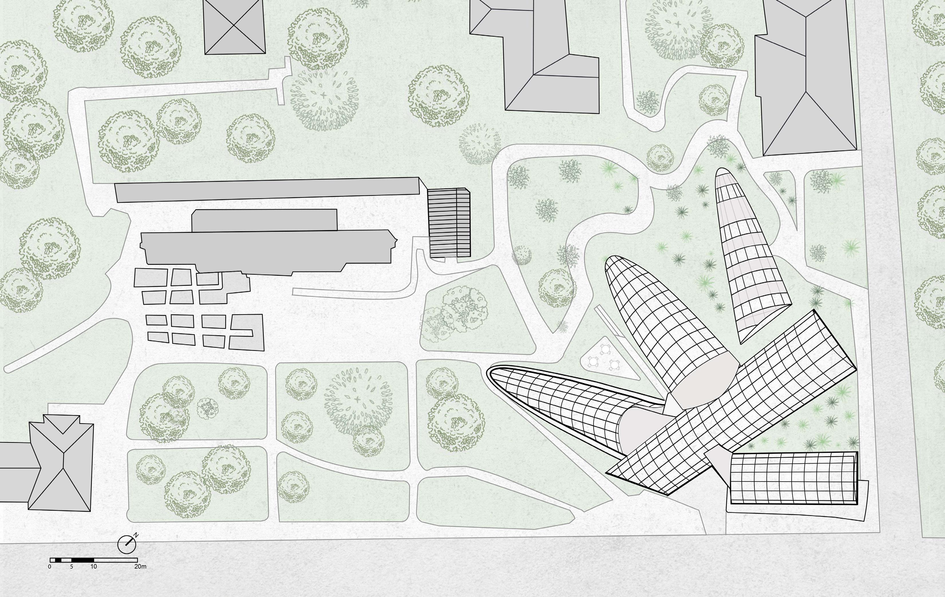 The goal of our expansion and adaptation is to integrate the new buildings with the existing ones while improving the technology and innovation of the new structures. Since the existing botanical garden is located at a University, we decided to incorporate a community garden as the complementary program.