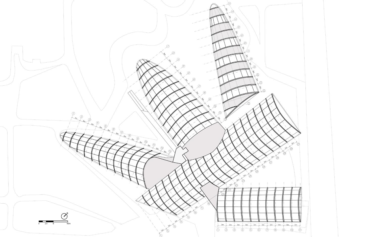 The overall goal is to integrate the new buildings with the existing while improving the technology and innovation of the new structures. We are also proposing adding to the existing landscaping surrounding the buildings. The garden will connect the existing glasshouses with local fauna and flora and expand the existing biophelia. This will benefit the users and the local surroundings.