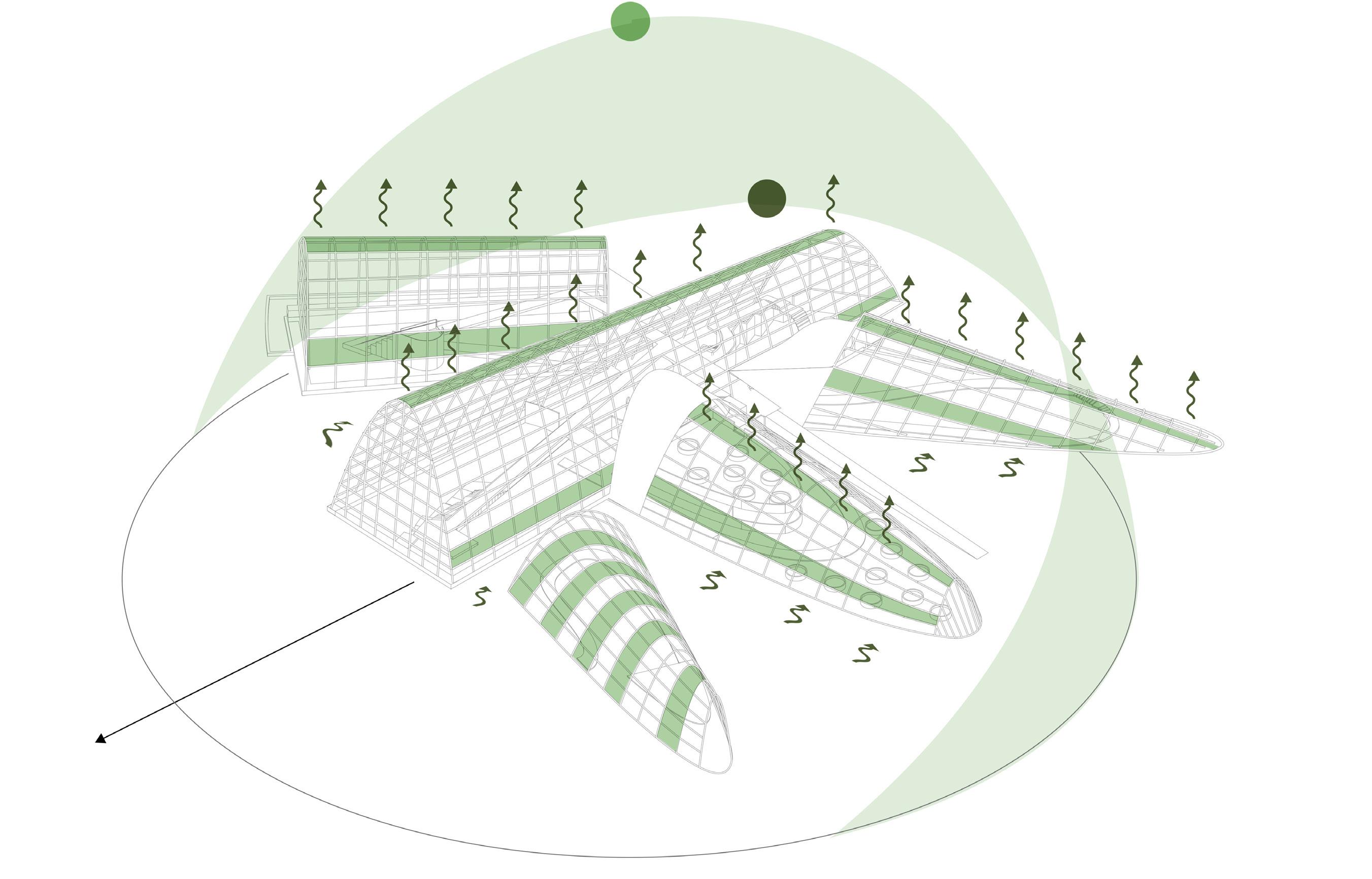 VENTILATION WARM AIR RELEASED THROUGH PASSIVE VENTILATION OPERABLE WINDOWS FOR VENTILATION ALONG TOP AND BOTTOM OF STRUCTURES