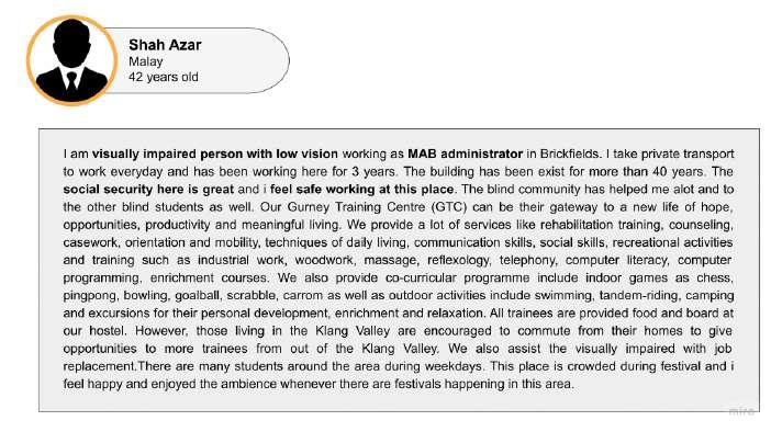 To obtain comprehensive information from a different perspective about the site, we separated those who are working or staying around Brickfield into different groups, including business operators, the visually impaired, education or associations, residents, and tourists.