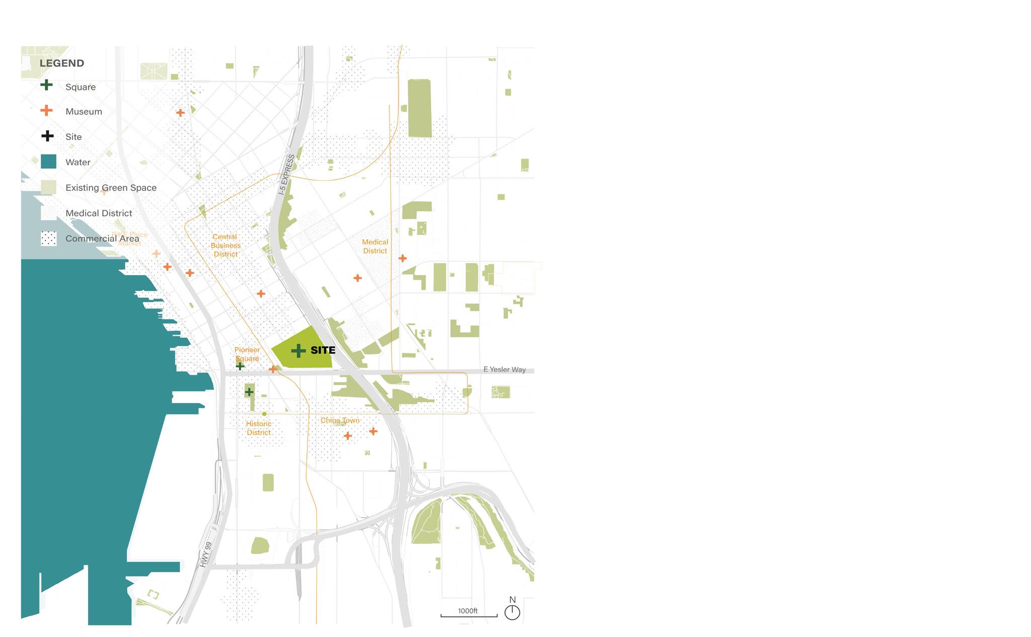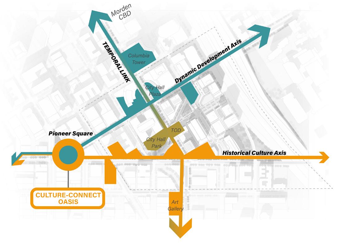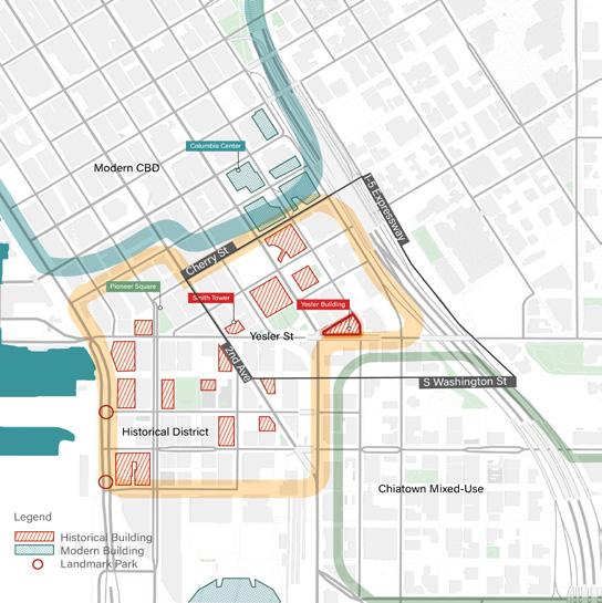 2. Historically, there are three important nodes on the landscape axis, which respectively represent Seattle's melting and integration in the early 20th century, the evolution of public services in the mid-20th century, and now and a future community that will be gradually established in the future. It starts from the Pioneer Square which represents the heart of the city's early development at the end of the 19th century.