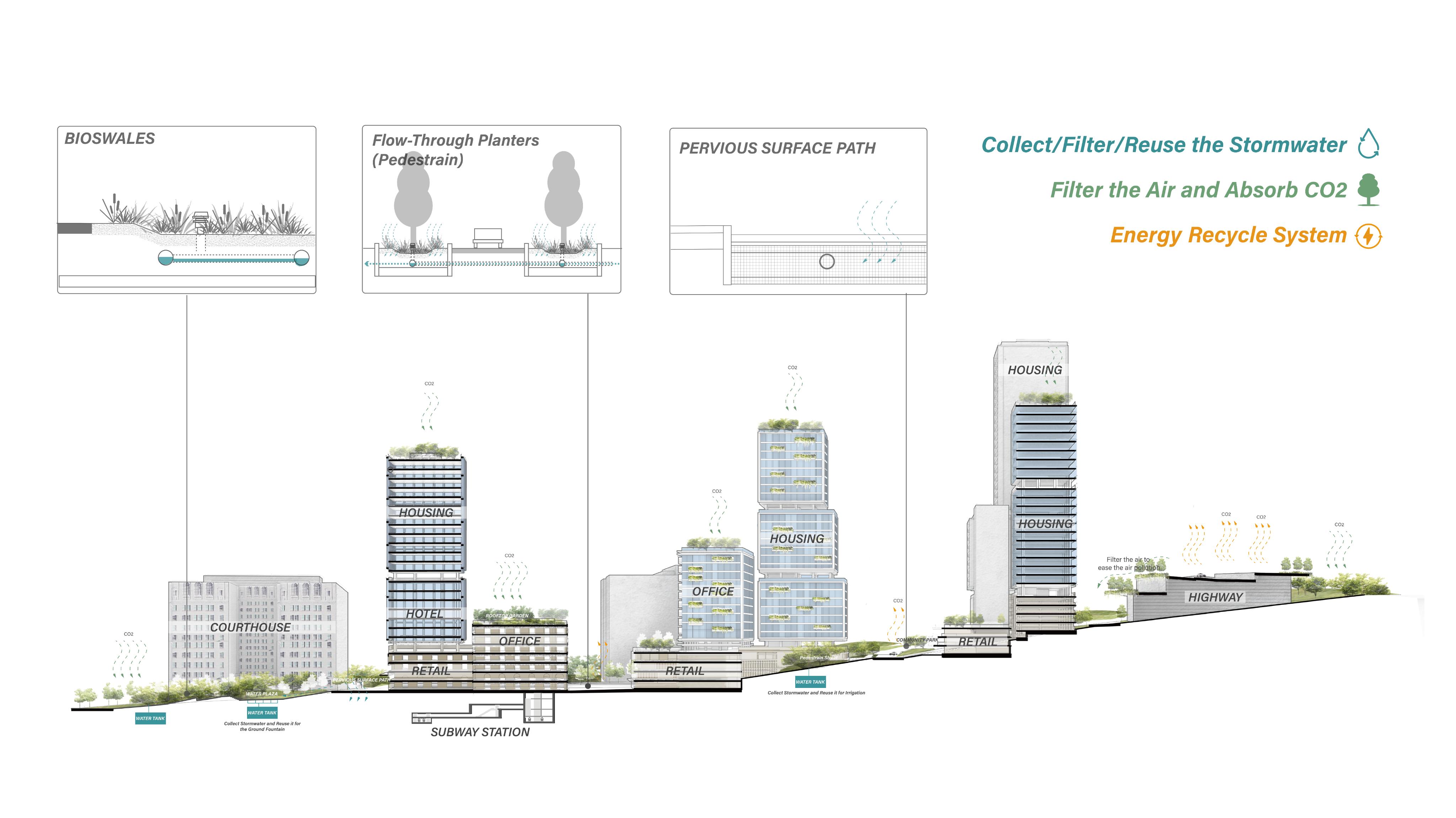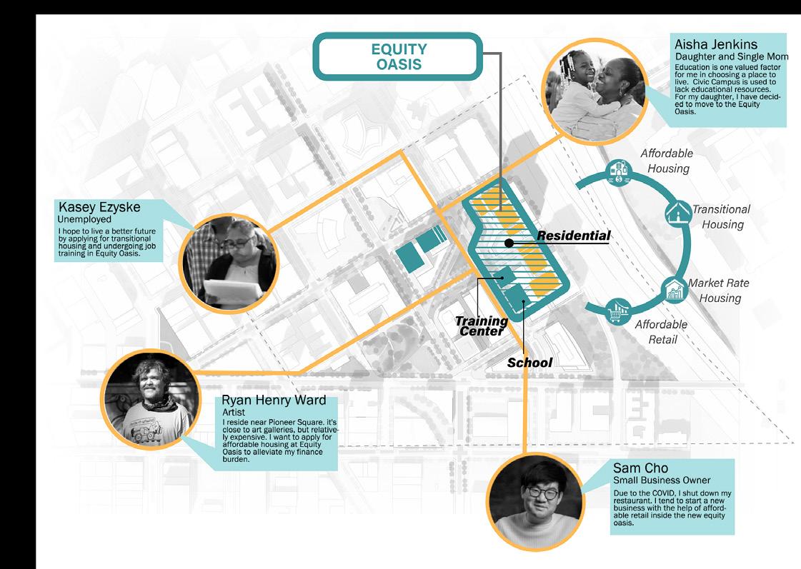 "Trio Oases" embodies the dream of a community where balance, equity, and nature converge to create not just living spaces, but a nurturing ground for both the souls and the environment. This reparative project is grounded in three core concepts. Connectivity Oasis is a fusion culture TOD hub based on Courthouse and the future Sounder station. Equity Oasis is two high-rise residential complexes connected by a community courtyard that includes affordable housing and educational resources. Sustainability Oasis is a series of green corridors connecting the waterfront space, Pioneer Square, with historic sites, neighborhoods, and across highway barriers.