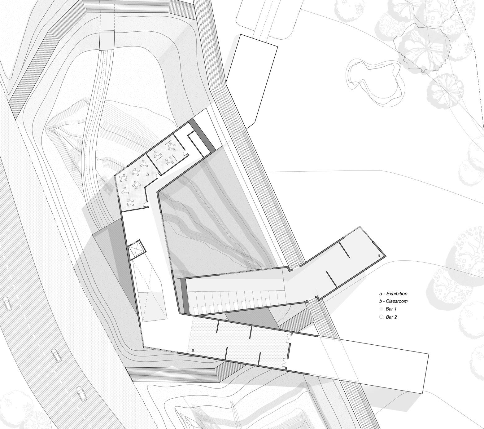 The building's design emphasizes circulation, with intersecting bars creating varied routes and experiences. These bars allow visitors to explore from the parking lot to the basins and back, offering choices in travel time. Their intersection creates dynamic spaces, and they smartly encircle equipment areas for safety and visual engagement.