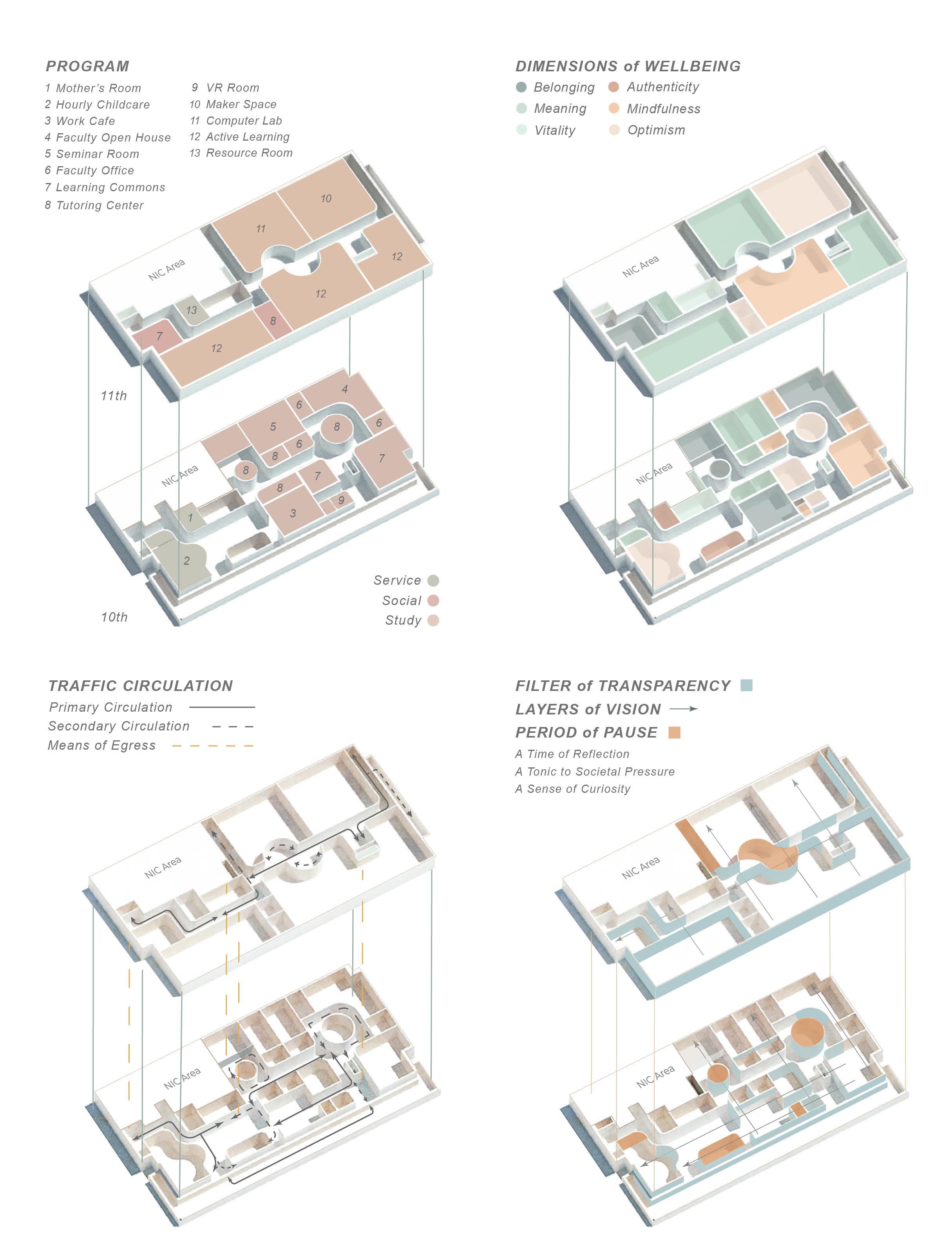 NEXT HUB has a vision to increase its reach into a large urban population of all ages to gather, connect, explore, and engage in active and diverse educational experiences. It believes that adults in this city need convenient ways to grow, improve, and stay relevant in the market. Thus, it would be a place for students and current workers who are enrolled in online coursework to gather and engage with others doing the same. Also, it would help adult learners who might not be able to afford or juggle childcare to further their education. Also, the design concept of NEXT HUB is to allow each person to create their own learning journey which is achieved by three spatial elements: Layers of Visions, Filter of Transparency, and Period of Pause.