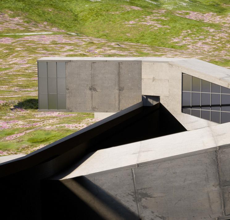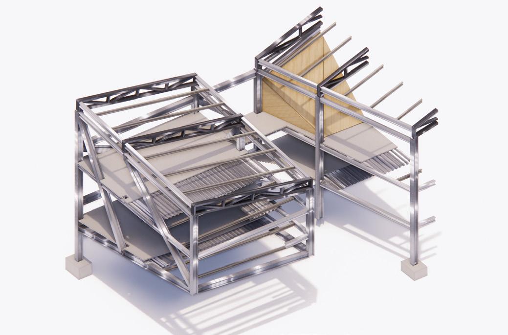 Our building unifies 3 Theds, with the middle one serving as a nod to the original shed and 2 courtyards nestled in between, creating negative shed spaces. The 3 sheds and 2 courtyards provide a horizontal groundscape connecting a multitude of spatial conditions that are necessary for our research focus, which is recycled concrete. It encompasses heavy-duty work spaces such as the process of mixing, collection, sorting, and testing of existing concrete fragments. Also, the “3 Sheds and 2 Courtyards” is able to accommodate staff and visitors, to engage with those moments while maintaining strategic privacy for back-of-house functions. As mentioned, the middle shed of the three sheds coincides with where the initial shed was and our interest is to develop the project by using the original shed’s typology and absorbing it into the new project proposal so that we can refer to the memory of it.