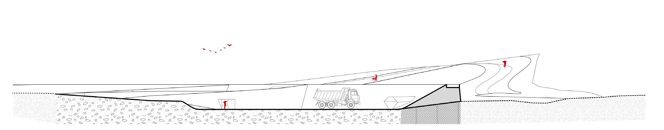 Our design integrates channels into the golf course landscape to direct runoff into retention basins, utilizing a gradient of gravel sizes for effective water filtration. This system is essential during heavy rains, with elevated paths providing the only walkable routes. We've contrasted the vast openness of the gravel fields with the enclosed feeling of the culverts for diverse landscape experiences.