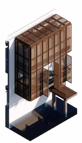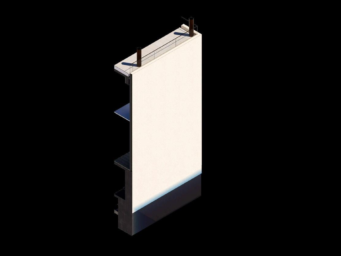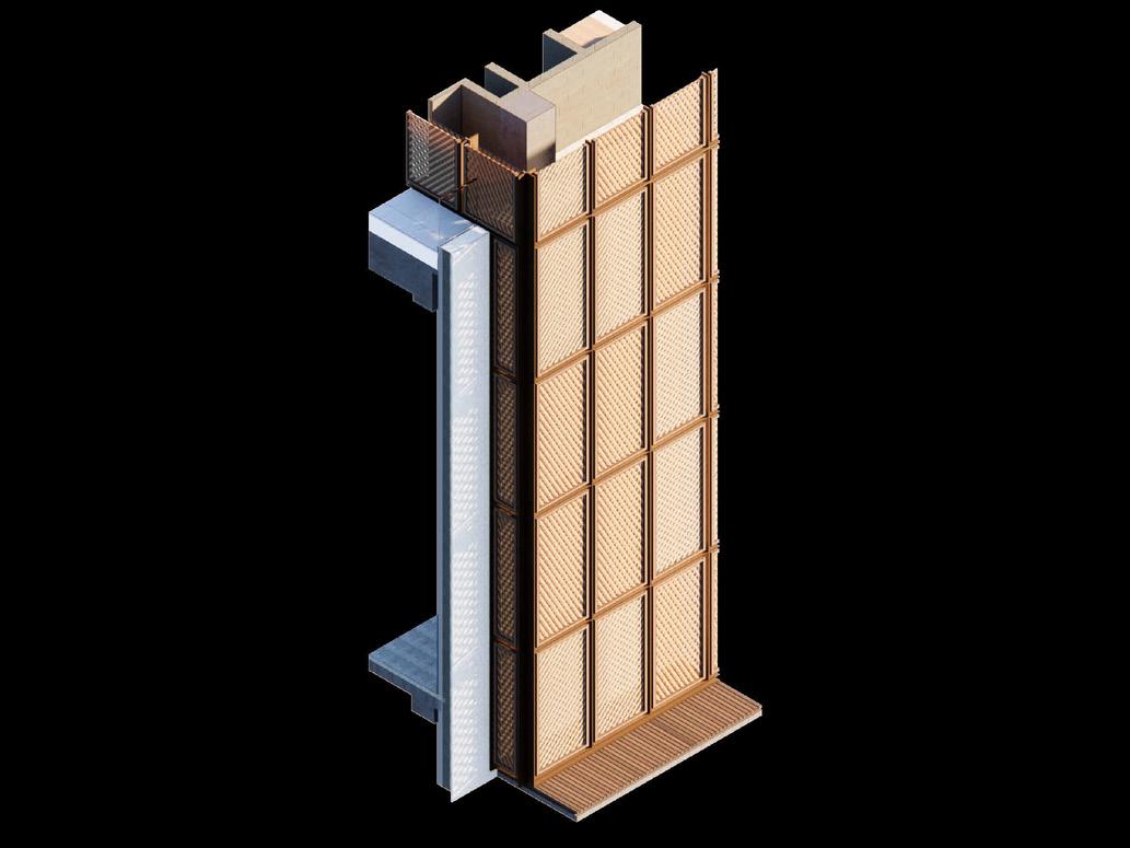 These elements synergize to fortify the structure's stability while optimizing the available space, ensuring the overhang is not only functional but also aesthetically engaging. The building's facade complements this with a contemporary dry cladding system, where tiles are neatly secured using clips on steel channels that interlock with the I-beams. This method not only enhances the building's visual appeal with a clean, refined finish but also promises longevity and resilience against environmental factors. Together, these design choices encapsulate a blend of innovation, efficiency, and architectural beauty.