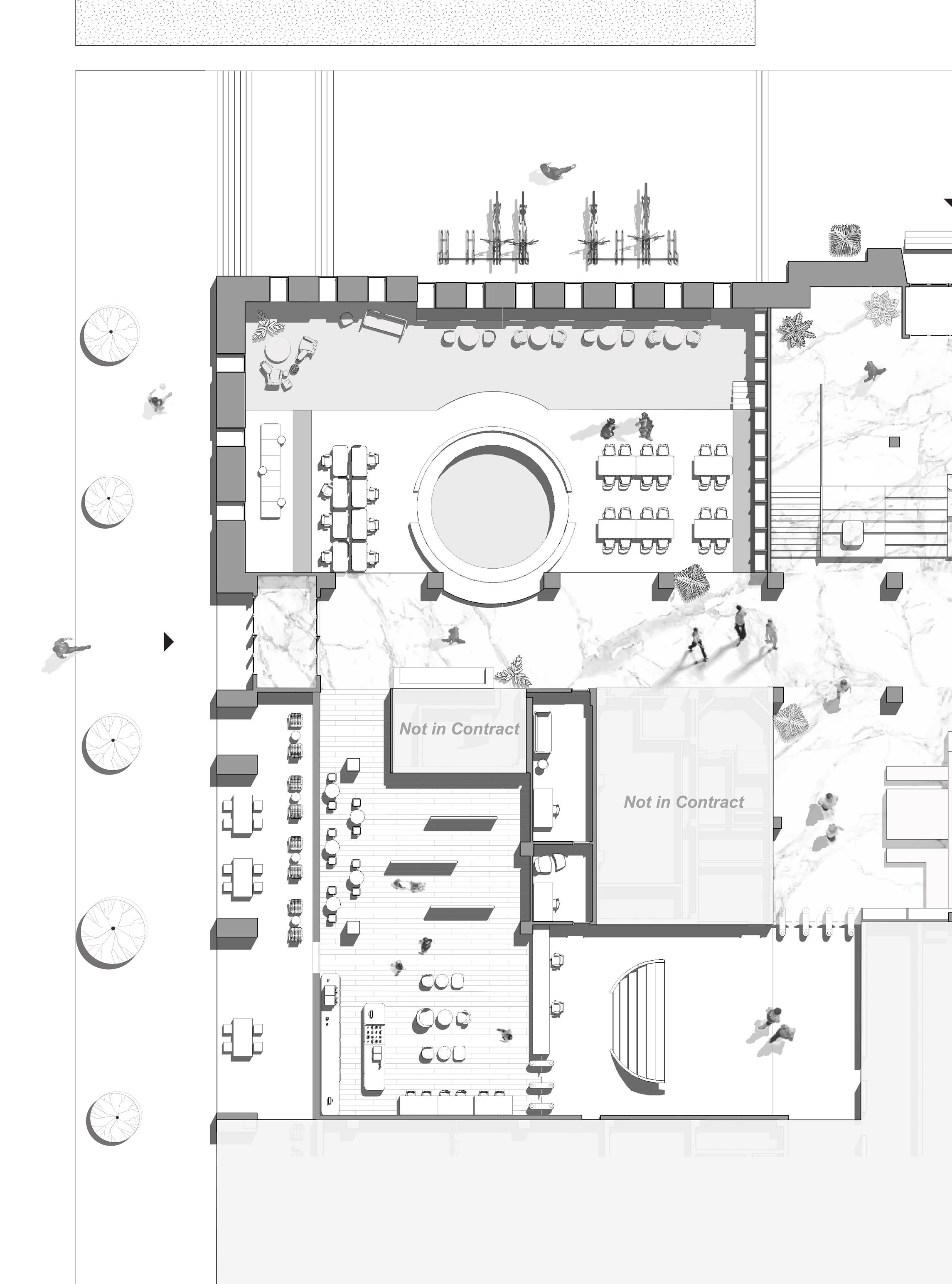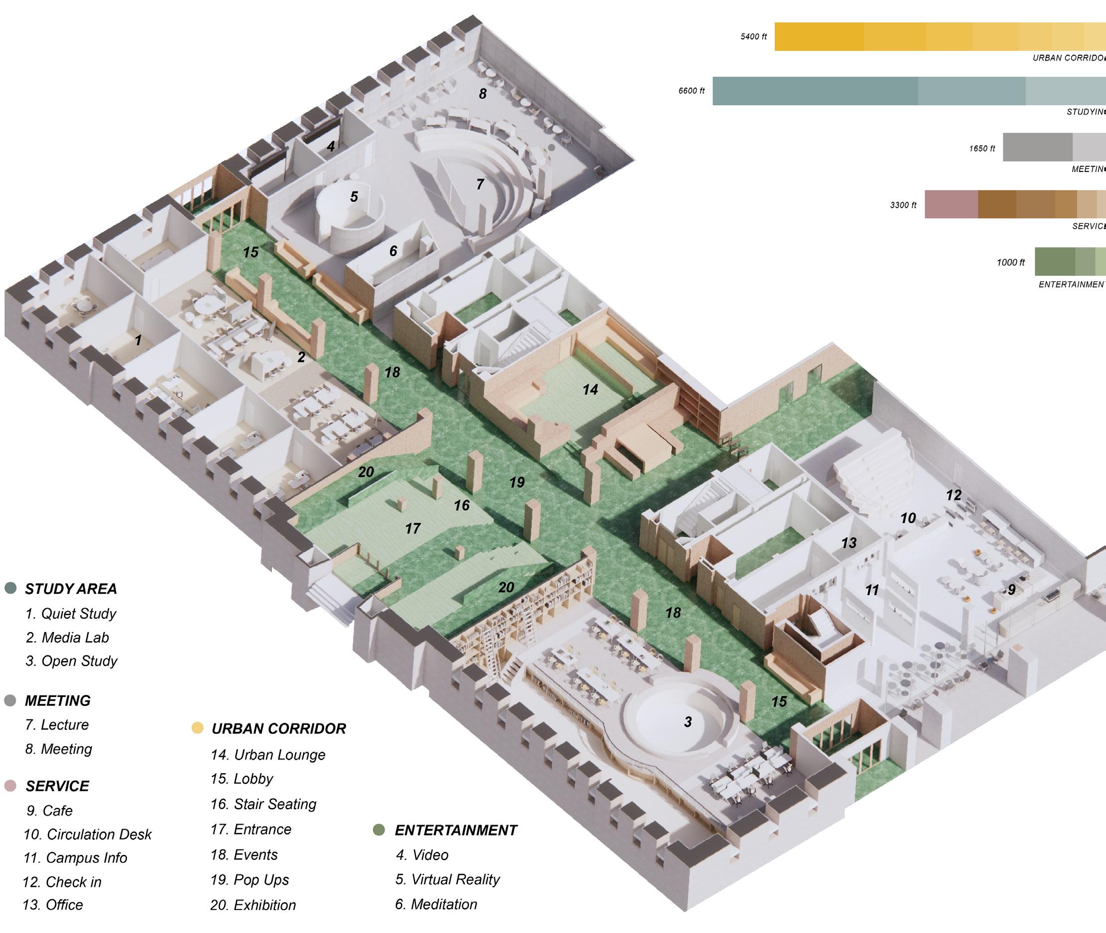 The reimagined space is strategically segmented into five functional areas: the Urban Corridor, Study, Meeting, Service, and Entertainment zones. This thoughtful arrangement not only streamlines space utilization but also crafts distinct ambiances and experiences within each zone, reflecting the diverse needs and rhythms of campus life.