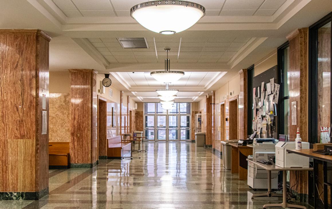 Memorial Library, the biggest library at UW-Madison, was first constructed in 1953 and underwent two major renovations and expansions in 1974 and 1990. Due to its central location in the city, Memorial Library is always a "hot spot" almost impossible to miss. Now the library is over 350,000 square feet, able to host 2,370 people and serves over one million guests per year. The university has planned to renovate the west corridor on the ground floor in order to better meet the needs of 21st century library. This is a picture of the hallway in the west corridor, looking towards the north. The space features with pink brownish marble columns and green marble floors with some customized design wood furniture.