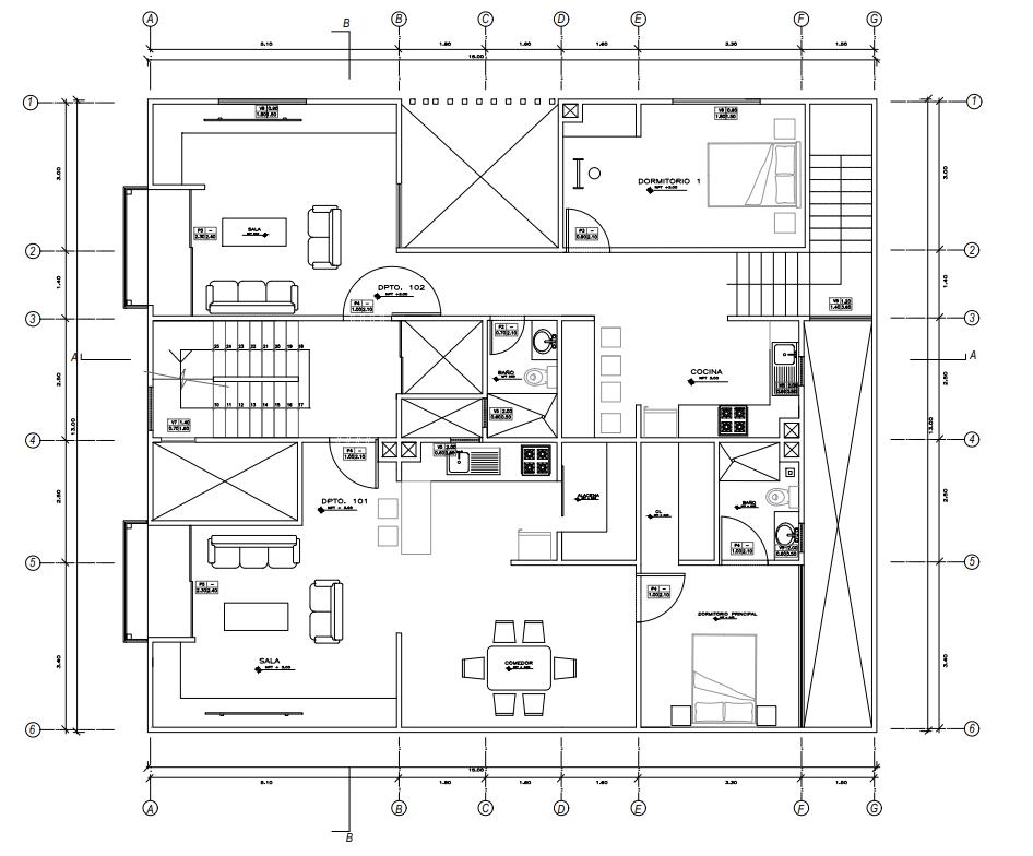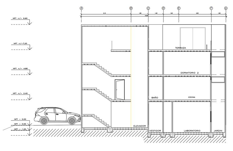 En el segundo nivel empezamos a encontrar los departamentos. El departamento 101 esta diseñado para la pareja de esposos Clara y Martin, Clara es chef y profesora en la UPC, y Martin es dentista y establecera su consultorio en la parte del comercio.