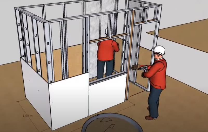 Criterios de seguridad en obra. Proceso constructivo de un muro de PDL Ensamblaje de un tabique de drywall a un muro de PDL