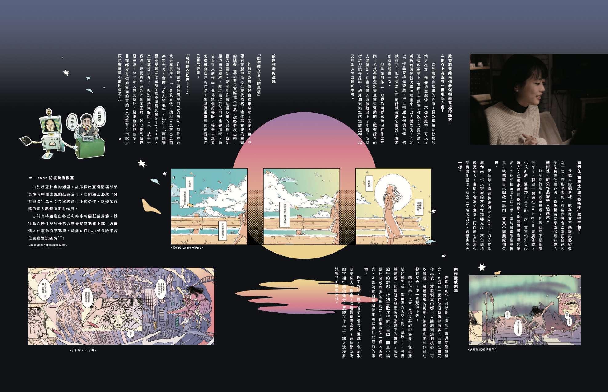 這期以太空為主題,邀請插畫家許彤作為專訪嘉賓,我參與了訪談到設計執行的過程,去 呈現符合刊物調性和畫家個性的排版。