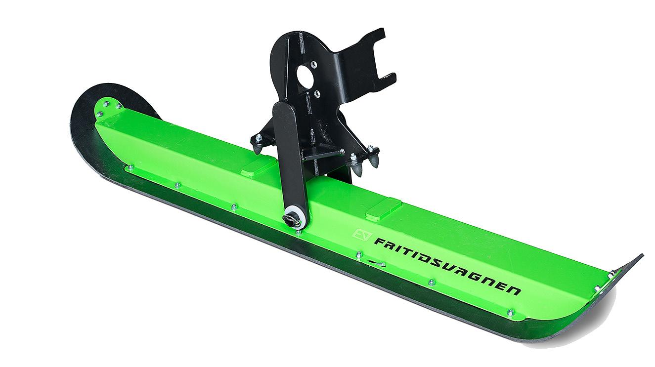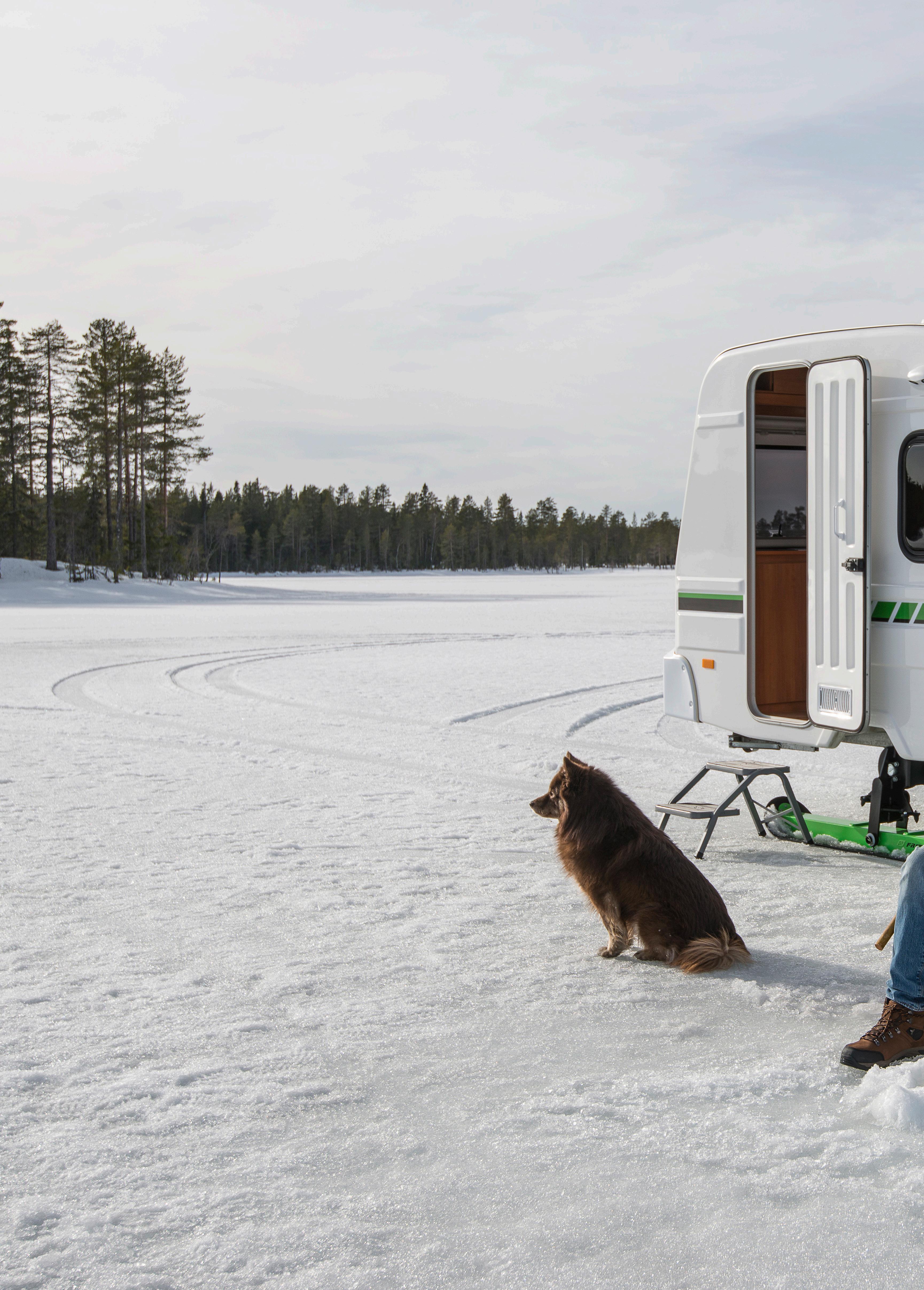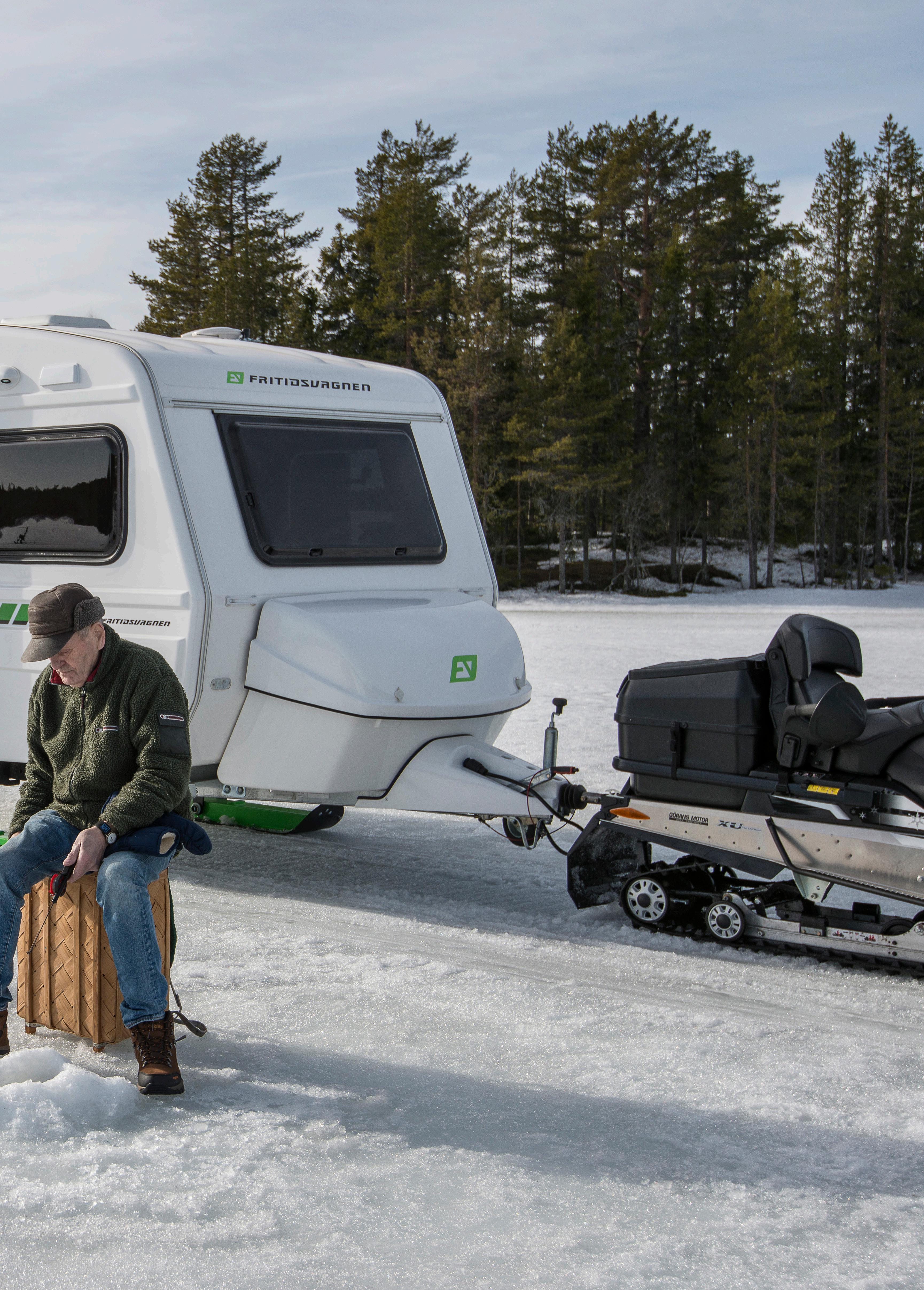 Det är till och med så att vi har tagit fram skidor till vagnen som tillval. Detta gör det möjligt att dra vagnen bakom en skoter eller en fyrhjuling med bandsats, nu är de flesta fiskesjöar nåbara även på vintern med Fritidsvagnen.