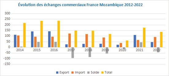 milhões de USD, (65 milhões de USD em 2021). As importações francesas originárias de Moçambique estão concentradas em duas categorias de produtos, nomeadamente artigos de joalharia e instrumentos musicais (48%) e metais ferrosos (39%).