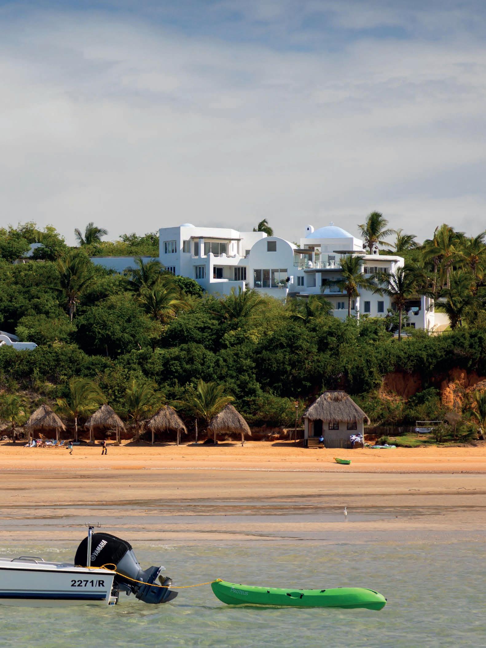 for demanding environments. Thus, a Mozambican villa was born with the soul of the Cyclades. Domes, curved chimneys, arched gates and undulating walls transport visitors to another latitude — a meticulously constructed illusion. Inside, pieces in driftwood style, hand-carved doors and custom-made decoration complete the setting. The white cement beds, with linen and jute, balance rusticity and elegance.