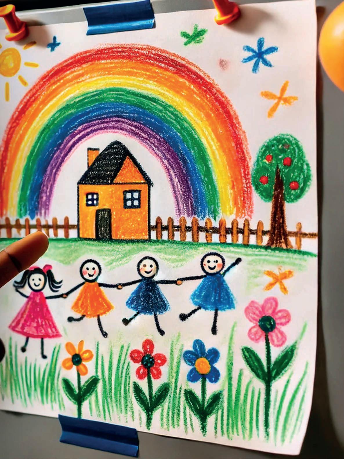 Uma bela noite, António sugeriu a Xiluvinha que fizesse um desenho especial. “Filhinha, quero que desenhes alguma coisa que faça as pessoas sorrirem sempre que olharem para ela,” disse ele, com um brilho nos olhos e uma ternura que só um pai pode ter. Xiluvinha, cheia de entusiasmo, pegou nos seus lápis de cor e começou a desenhar. Com cuidado e carinho, desenhou um arco-íris muito colorido, uma casa acolhedora, e um grupo de crianças a dançar de alegria num campo florido.