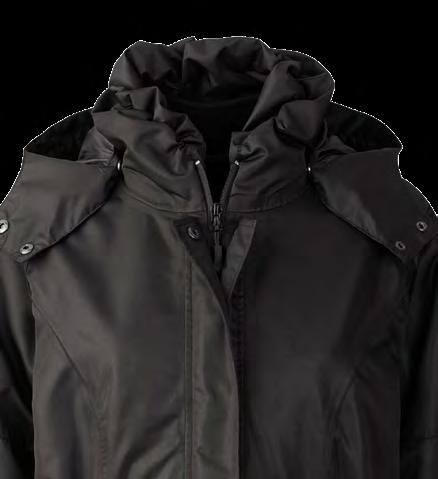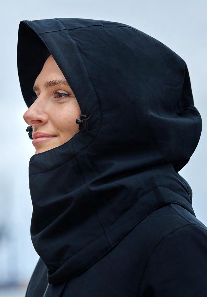 The adjustable hood can be tucked neatly into the collar for a clean, uniform look.
