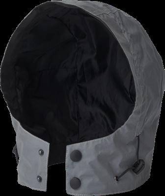 Hætte med refleks og plads til cykelhjelm. Kan gemmes væk i kraven og integreres i kravens forkant.