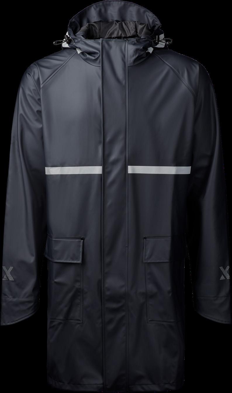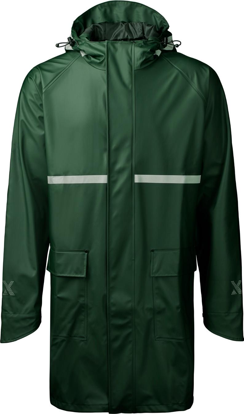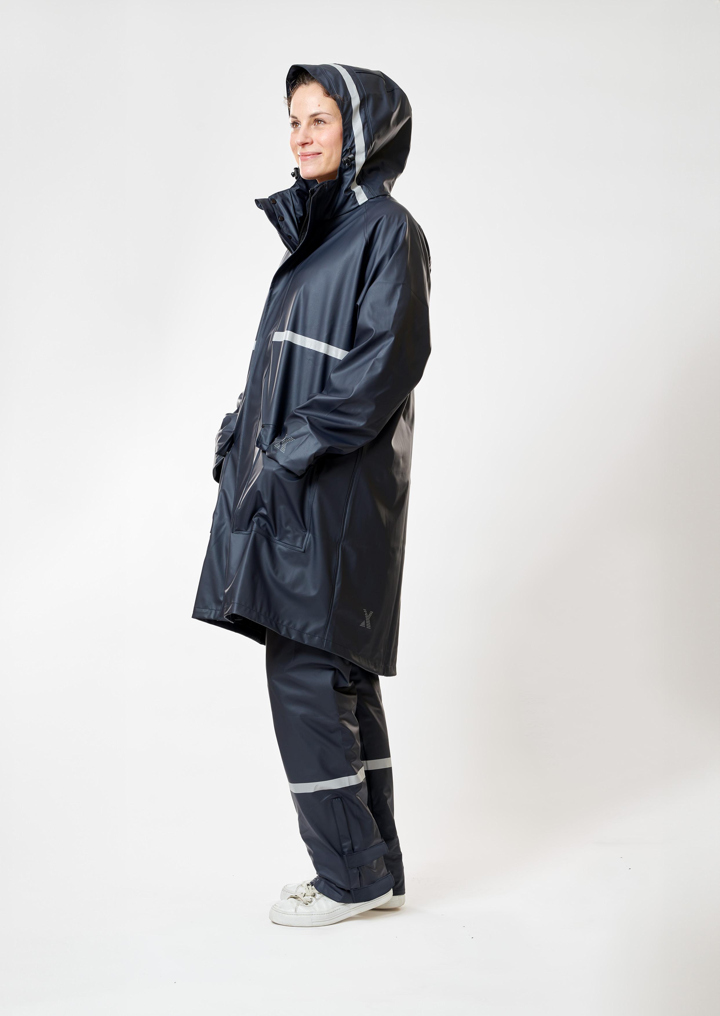 Regnfrakken går ned midt på lårene, så den er velegnet til f.eks. cyklende personale