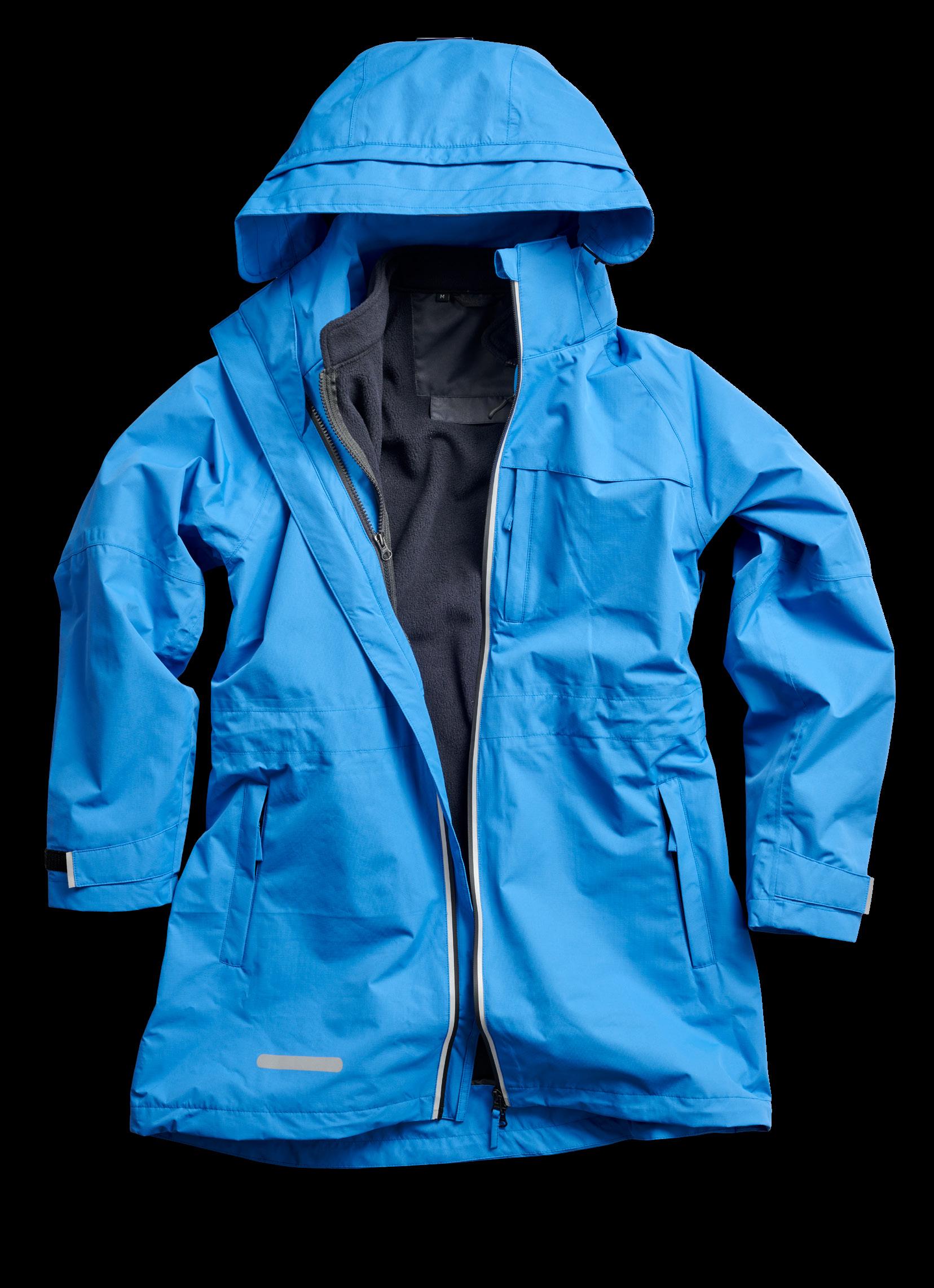 Frakken kombinerer en vandtæt skaljakke med en aftagelig inderjakke. Skaljakken er lavet i et vandtæt og åndbart 3-lags materiale med anti-krøl effekt, hvilket gør overfladen glat og fin. Den aftagelige inderjakken kan bruges separat og kan udskiftes med en varmere termojakke med thinsulate padding.