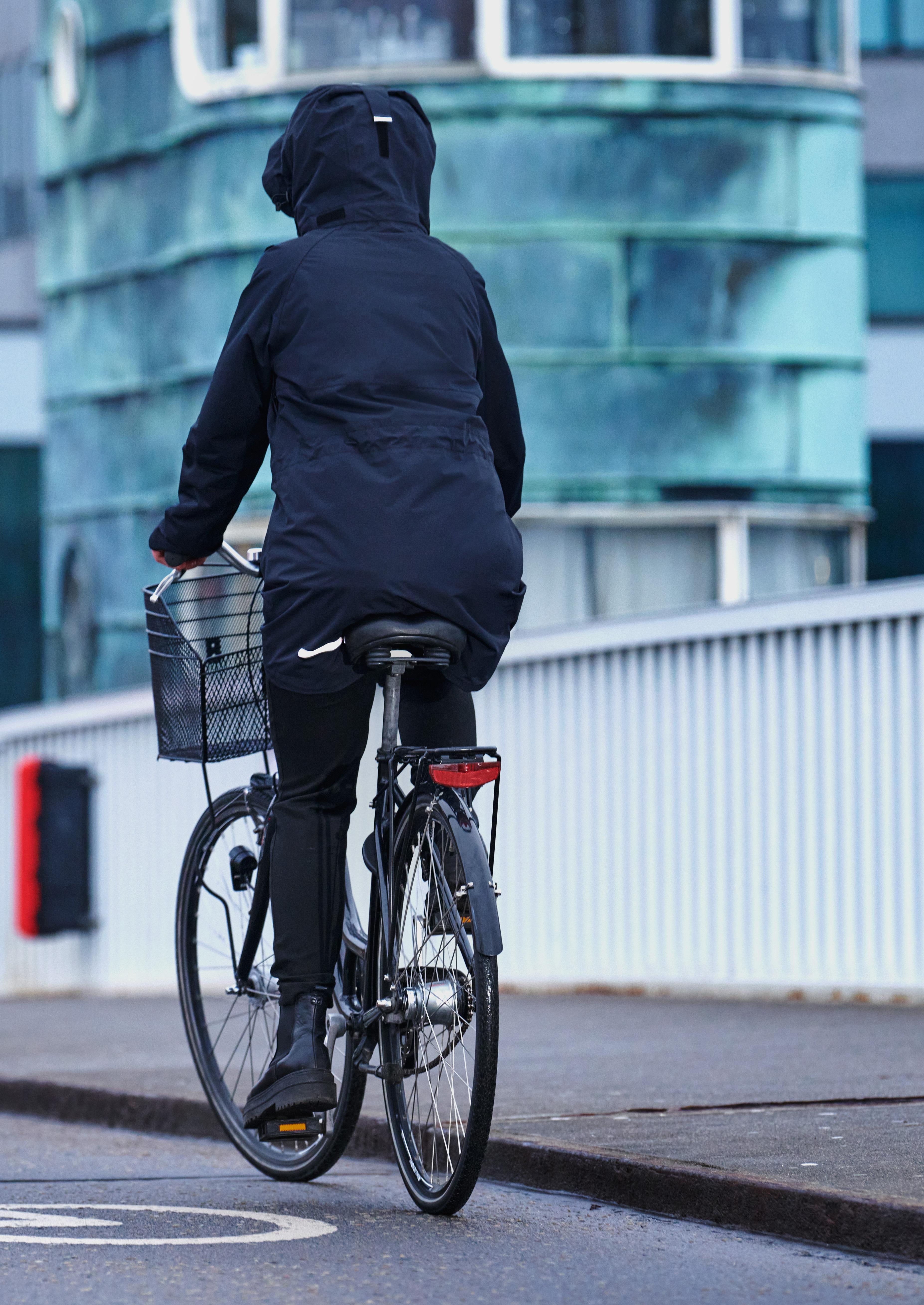 Længde og vidde på jakken gør den særlig velegnet til cyklende personale.