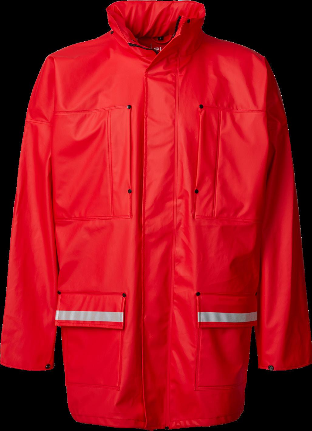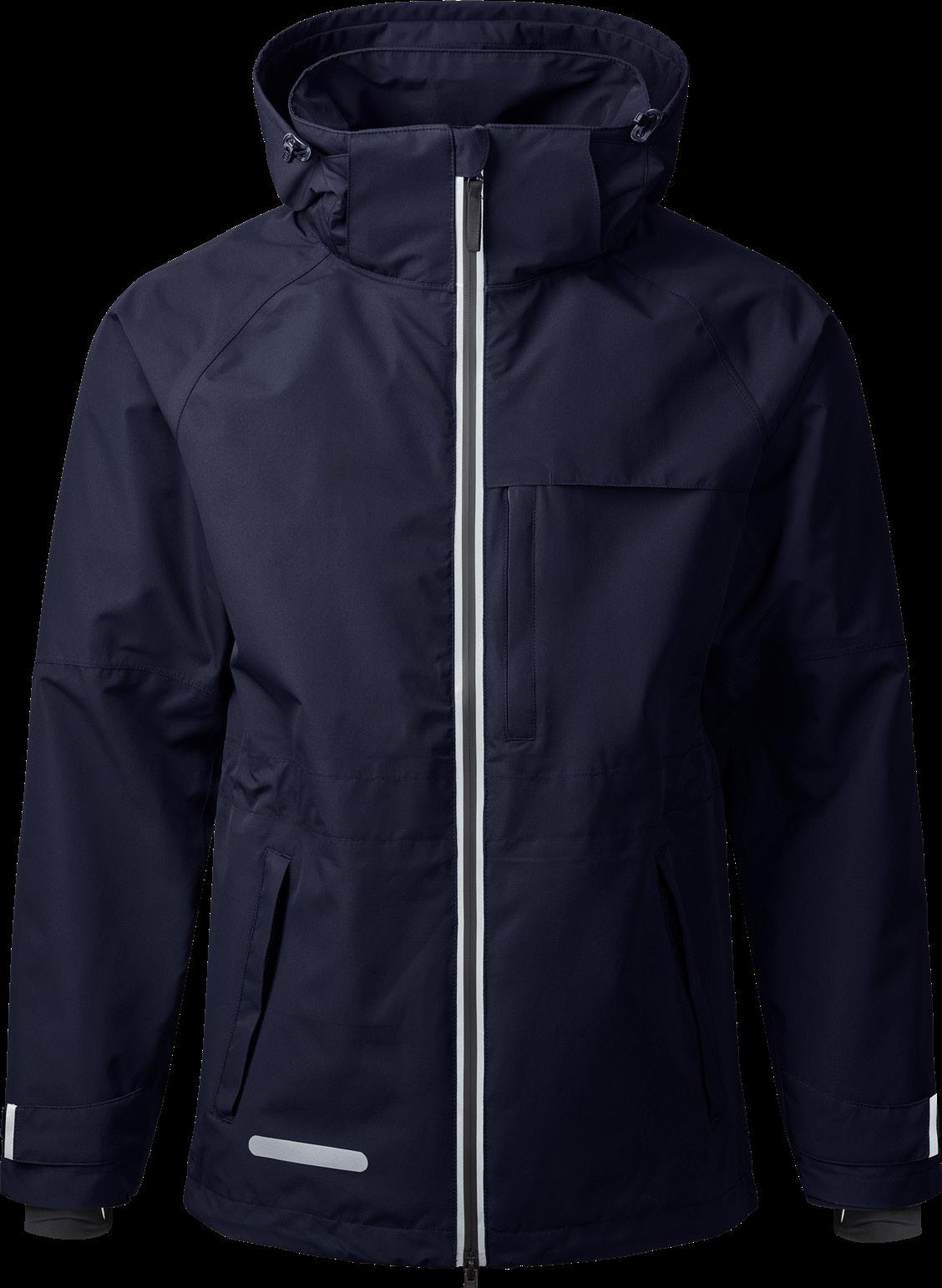 Skaljakke til mænd og kvinder med en længde, der dækker hoften og beskytter mod vandindtrængning.
