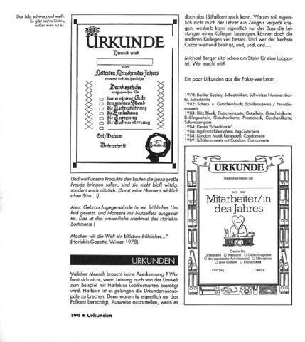 Und weil unsere Produkle den Leulen die ganz große Freude bringen sol/en, sind sie nicht bloß witzig, sondern auch nützlich. (Sonst wäre Nonsens wirklich ohne Sinn ... /) Also: Gebrauchsgegenslönde in ein fröhliches Umfeld gesetzt, und Nonsens mit Nutzeffekt ausgestallei. Das ist das wesentliche Merkmal des Har/ekinSortimenls I Mochen wir die Welt ein bißchen fröhlicher ... " (Harlekin-Gazette, Winter 1978)