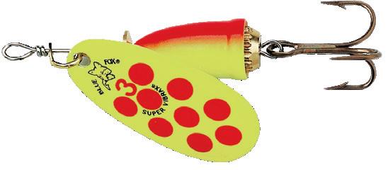 169 CELTA 42101 Weight: 2g Length: 4cm Per Pack: 2 Box Qty: 6 MSRP: $10.95 42102 Weight: 3.5g Length: 4cm Per Pack: 2 Box Qty: 6 MSRP: $10.95 42103 Weight: 5g Length: 4cm Per Pack: 2 Box Qty: 6 MSRP: $10.95 AMR - Red Mosaic ARN - Silver Red Black CLN - Copper Black ONPJ - Gold Black Yellow Dots ORN - Gold Red ANV - Silver Green Black BTG - Gold Brown Trout ONV - Gold Green Black OPR - Gold Red RTG - Gold Rainbow Trout The Rublex Celta Fishing Lure is a simple inline spinner that does not need any fine tuning works straight out of the packet. The body and the blade both spin reducing dreaded line twists. High quality brass finish plus colour print on the blade attract fish and strikes.